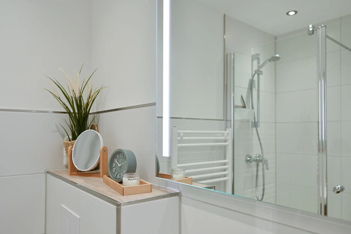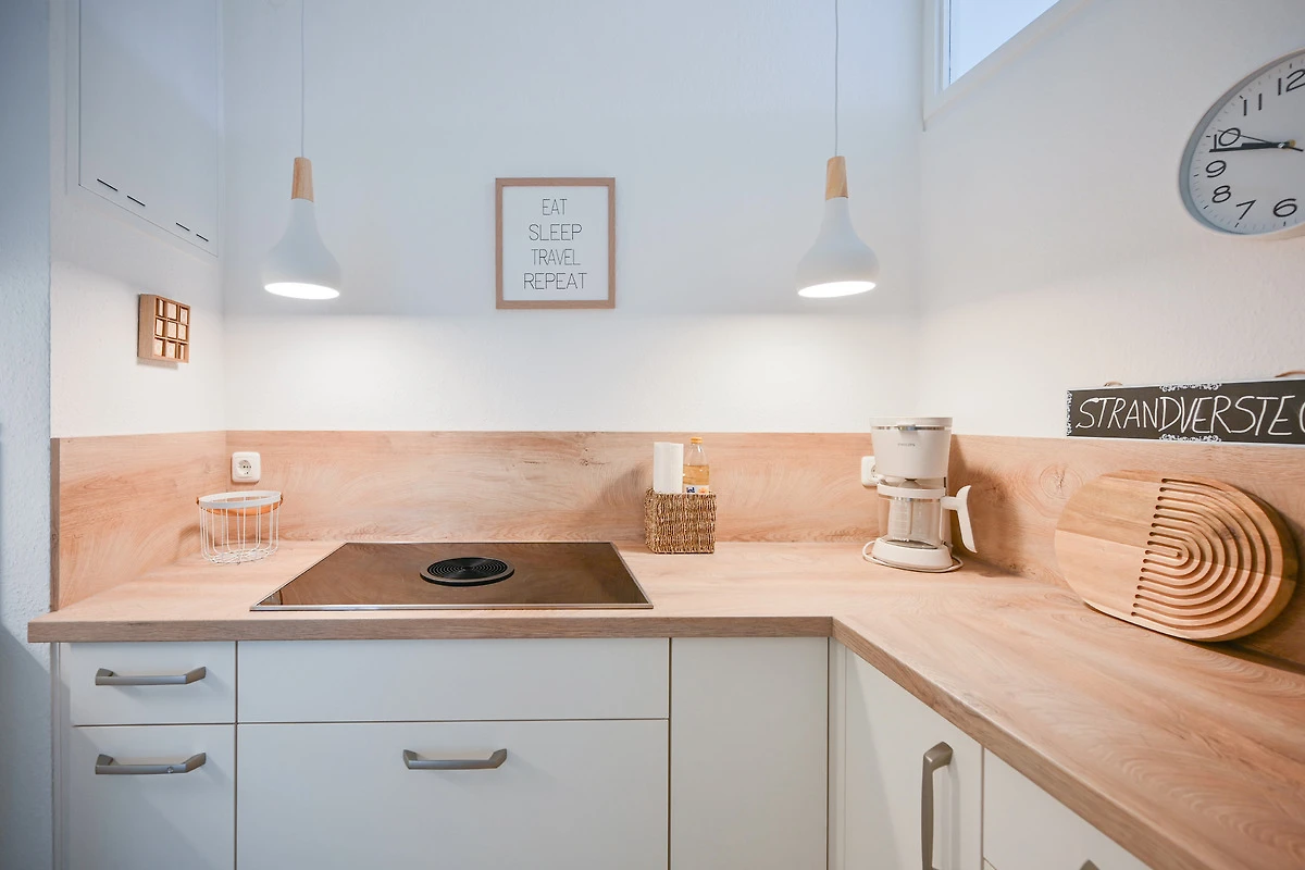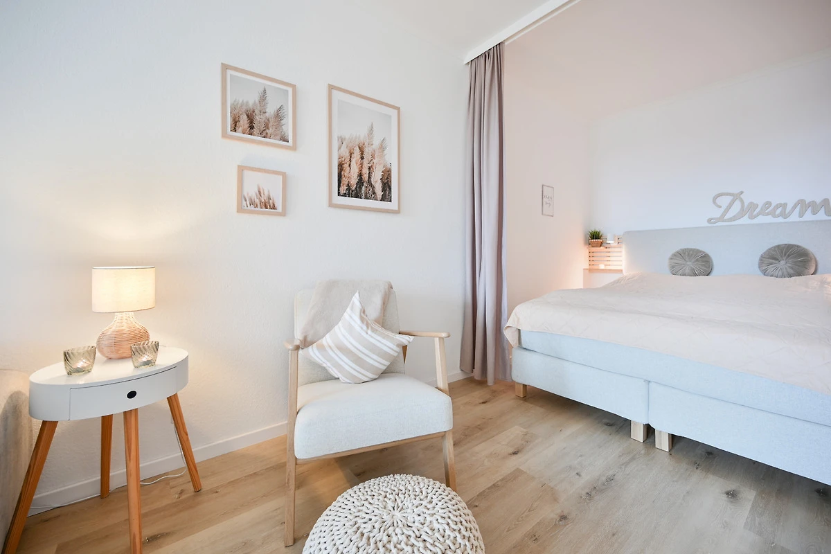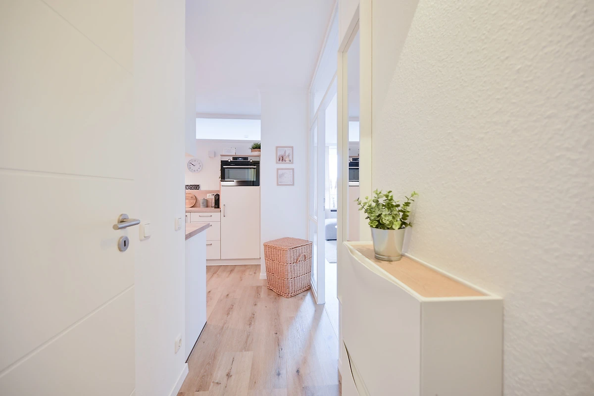 Mit einer toppneuen und modernen Ausstattung begrüsst Sie Ihre Ferienwohnung für die bevorstehenden Urlaubstage. Es erwartet Sie ein heller Wohn- & Schlafbereich, der modern und grosszügig eingerichtet ist. Machen Sie es sich auf der Couch oder im Boxspringbett (160 cm) des optisch abgetrennten Schlafbereichs gemütlich. Die im Flur integrierte, geräumige neue Küche ist perfekt mit nahezu allen Annehmlichkeiten (Spülmaschine, Kühlschrank mit Gefrierfach von Liebherr, Induktionsherd mit BORA Dunstabzug, AEG Backofen mit Mikrowelle) ausgestattet und lädt zum Kochen ein- wenn Sie möchten. Das tolle neue Bad ist mit einer geräumiger Walk-in-Dusche (120 cm) mit grosser Glasabtrennung inkl. Tür, einem Waschtisch, Handtuchheizkörper, WC und beleuchtetem Spiegel ausgestattet. Des Weiteren verfügt die Wohnung über ein kleines Esszimmer mit rundem Tisch, der erhöht auf einem Podest am Fenster steht. In diesem Raum stehen auch die Kleiderschränke für Sie zur Verfügung. WLAN steht zur Verfügung.