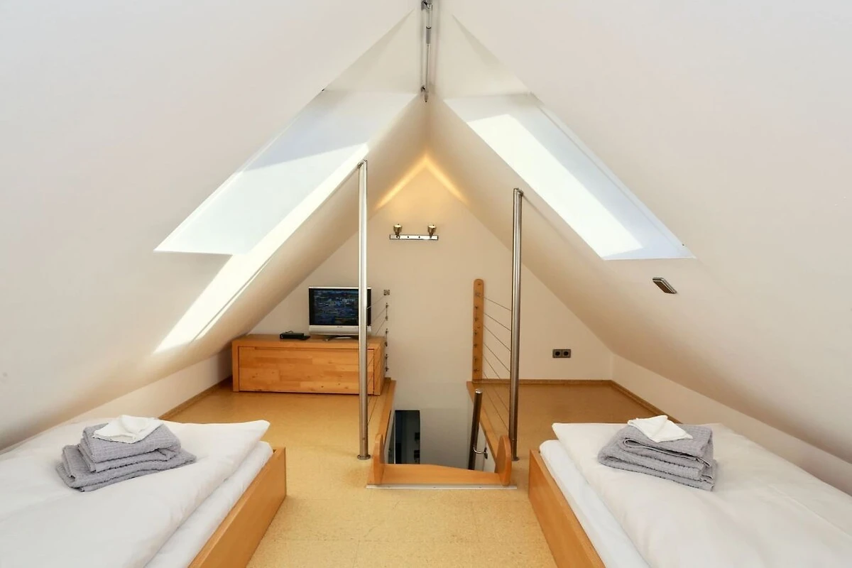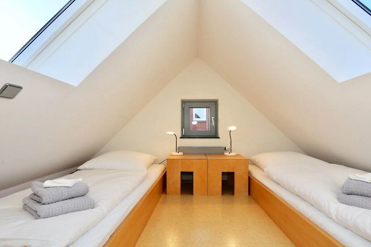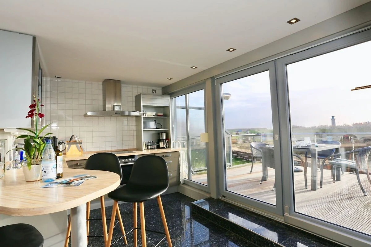 Die Wohnung Kaphaus verfügt über insgesamt 4 Betten (2 im offenen Spitzdach, welches nicht mit einer Kindersicherung abgesichert ist, sowie ein Doppelbett im separaten Zimmer im Erdgeschoss). Eine gehobene Ausstattung ist Markenzeichen der Wohnung. Des weiteren gibt es einen modernen, hellen Wohnbereich mit einer offener Küchenzeile und Esstisch. Das großzügige Bad ist ausgestattet mit Doppelwaschbecken, WC und ebenerdiger Dusche. Vom großen Südbalkon genießen Sie den wunderschönen Ausblick auf das Wattenmeer, den Hafen und den Juister Leuchtturm,.
