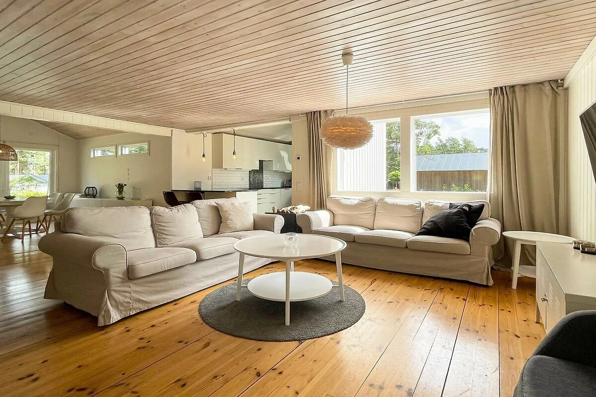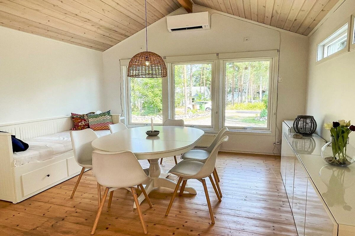 Schönes Ferienhaus mit herrlicher Lage nahe der Küste, in der wunderschönen Ferienidylle von Oknö. Hier wohnen Sie auf zwei separate Gebäude verteilt, perfekt falls Sie z.B. zwei Familien sind, die gemeinsam den Urlaub verbringen möchten. Vom Steg aus sind es nur 170 m bis zu einem erfrischenden Bad im Meer und der schöne Badestrand liegt direkt nebenan. Sie haben eine schön verglaste Veranda am Haus sowie ein großes Gartengrundstück mit Terrasse, auf der Sie entspannen und schöne Sommertage genießen können. Das größere Ferienhaus verfügt über ein geräumiges, offenes Wohnzimmer, in dem Sie eine Sitzecke haben, in der Sie den Blick zum Meer zwischen den Bäumen hindurch genießen können. Dazu kommt ein schöner Essbereich vor dem Holzofen und eine helle Küche. Smart-TV und WLAN sind vorhanden. Im Haupthaus gibt es außerdem ein Schlafzimmer mit einem Doppel- und einem Etagenbett mit zwei Kojen. Dazu im Wohnzimmer ein Tagesbett, das zu einem Doppelbett umgebaut werden kann. Den kleineren Annex nebenan erreichen Sie bequem über das Holzdeck außen. Dort schlafen Sie in zwei schönen, separaten Schlafzimmern mit je einem Doppelbett. In beiden Häusern gibt es ein Badezimmer mit WC, Waschbecken und Dusche. Im Annex steht zudem eine schöne, per Strom beheizbare Sauna bereit. Es gibt auch eine Waschmaschine und einen Trockner. Für verspielte Kinder steht auf dem Grundstück ein kleines Spielhaus zur Verfügung. Das Laden von Elektroautos über den Stromkreis des Hauses ist nicht gestattet. Für den Sommer 2025 wird das Haus gestrichen. Dann wird es weiß sein. Auf Oknö gibt es viele Strände und schöne Wanderwege. Sie befinden sich in der Nähe des Schwimmbads und Spielplatzes des Campingplatzes, wo es im Sommer ein Restaurant, ein Eiscafé, Veranstaltungen, einen Boots-, Fahrrad- und Tretautoverleih sowie einen kleinen Lebensmittelladen gibt, in dem Sie frisch gebackenes Brot kaufen können. Im Kaffetorpet können Sie einen guten Kaffee, verschiedene Veranstaltungen und traditionelle Mittsommerfeiern genießen.