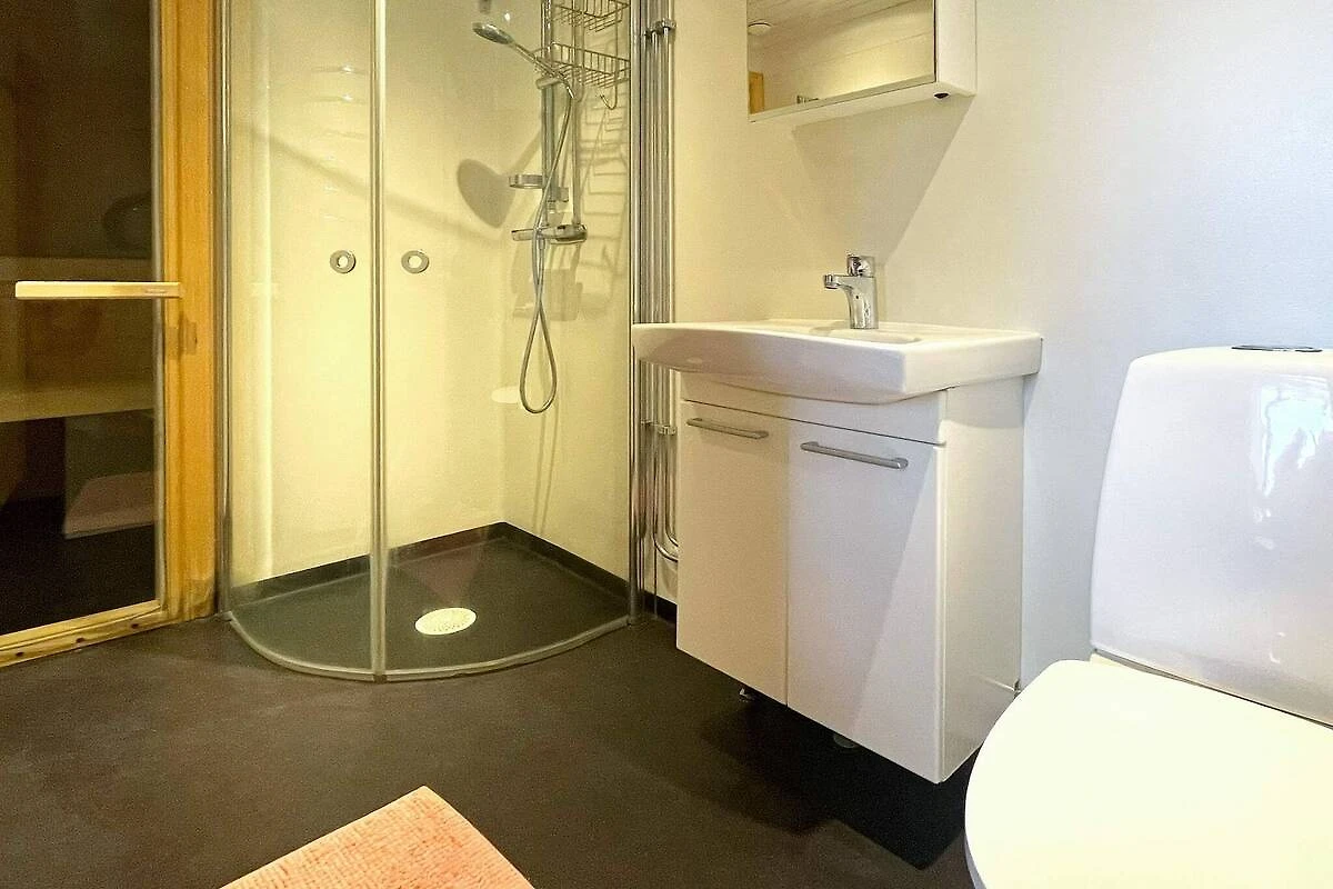 Küche(Kochherd(elektrisch), Kaffeemaschine, Mikrowelle, Kühl-/Gefrierkombination), Wohn-/Schlafzimmer, Schlafzimmer(Doppelbett, 2x Etagenbett), Badezimmer(Trockner, Waschbecken, Dusche, Toilette, Waschmaschine), Badezimmer(Waschbecken, Dusche, Toilette), Sauna(im Innenbereich, 4 Personen), Balkon, Heizung(elektrisch), Gartenmöbel, Parkplatz