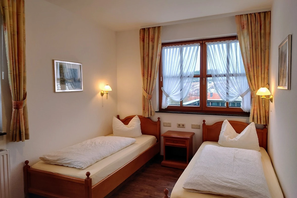 Die Wohnung "Lichter.Spiel" befindet sich in der ersten Etage. Der Wohnraum ist gemütlich im Landhausstil eingerichtet und verfügt u.a. über einen Flatscreen-TV. In der offenen Wohnküche stehen Geschirr, Wasserkocher, Kaffeemaschine, Toaster, Geschirrspüler und ein Mikrowellenbackofen für sie bereit. Auf dem 2-flammigem Elektrokochfeld können sie sich Mahlzeiten zubereiten. Die Wohnung verfügt über zwei Schlafzimmer mit Einzelbetten.
