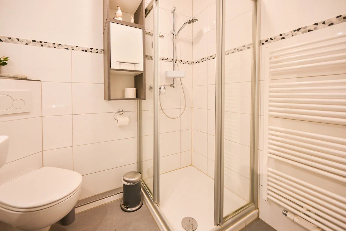 Das Badezimmer mit moderner Dusche und WC sowie die praktische Küchenzeile machen Ihren Ostseeurlaub perfekt.