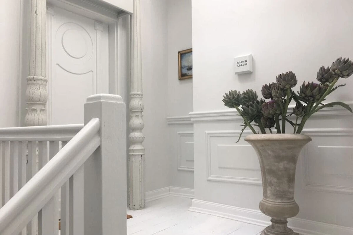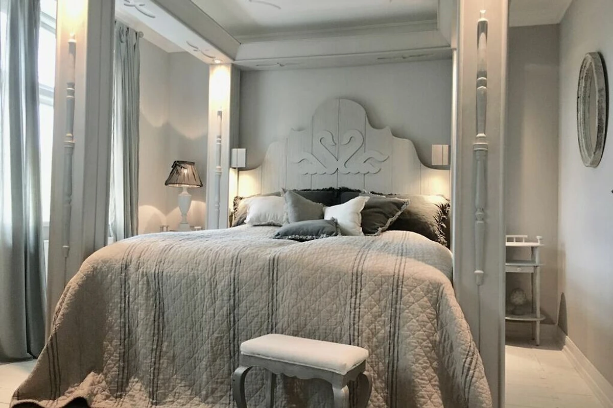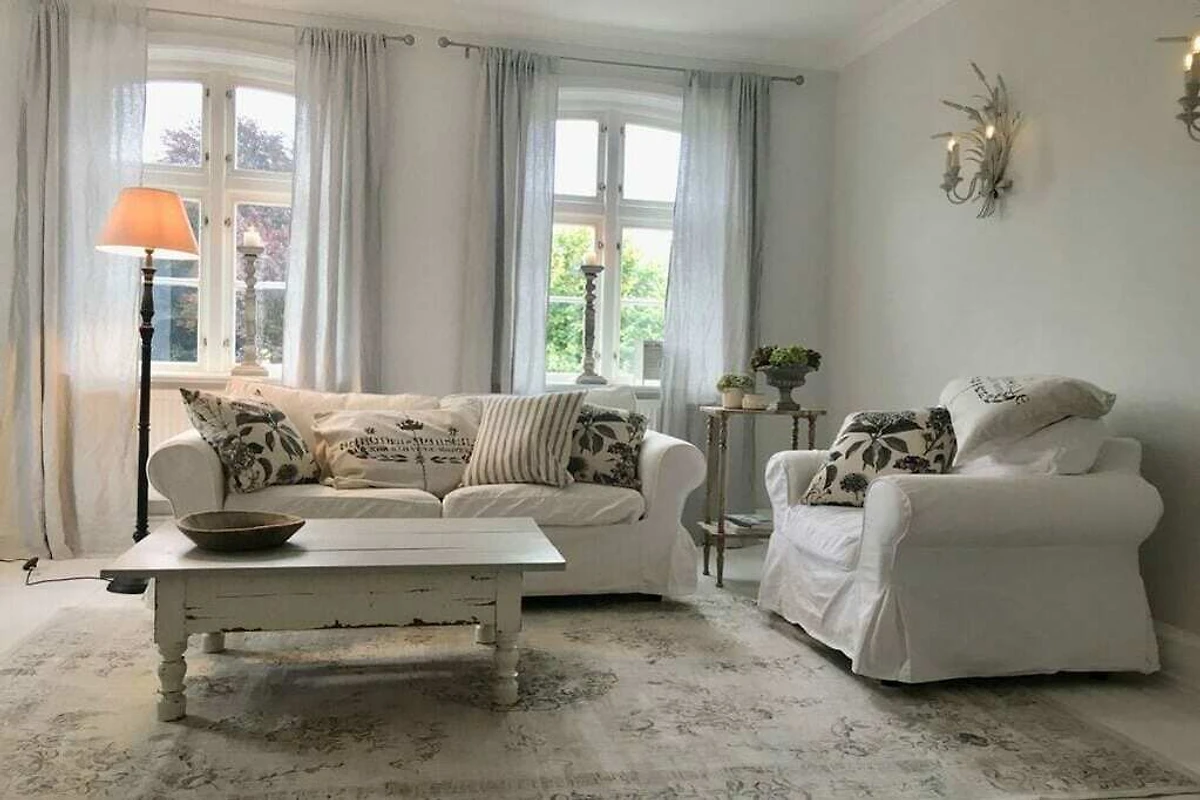 Nordische Antiquitäten in hellen Tönen, wunderschöne Stoffe und gemütliche Sitzmöglichkeiten machen diese Ferienwohnung