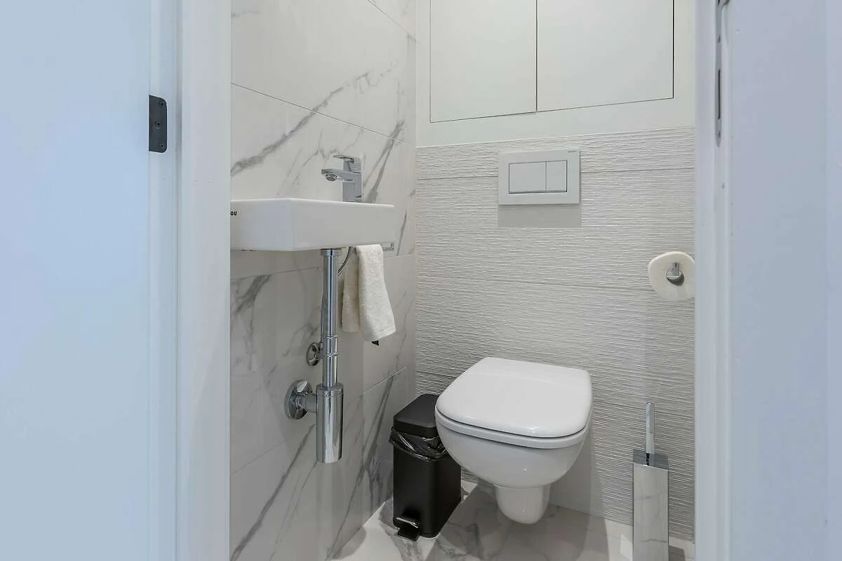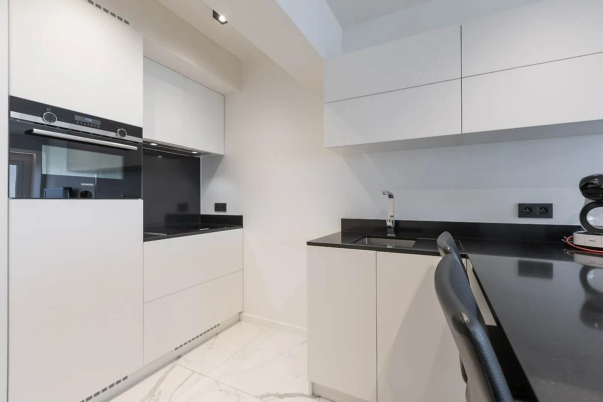Die voll ausgestattete Küche bietet mit Kaffeemaschine, Saftpresse, Backofen, Mikrowelle, Geschirrspüler und Kühl-Gefrierkombination alles, was Sie für hausgemachte Mahlzeiten benötigen. Das Schlafzimmer bietet ein geräumiges Doppelbett mit zwei Bettdecken, und das moderne Badezimmer ist mit Dusche und Haartrockner ausgestattet. Ein separates Gäste-WC sorgt für zusätzlichen Komfort, und ein Aufzug ermöglicht einen bequemen Zugang.