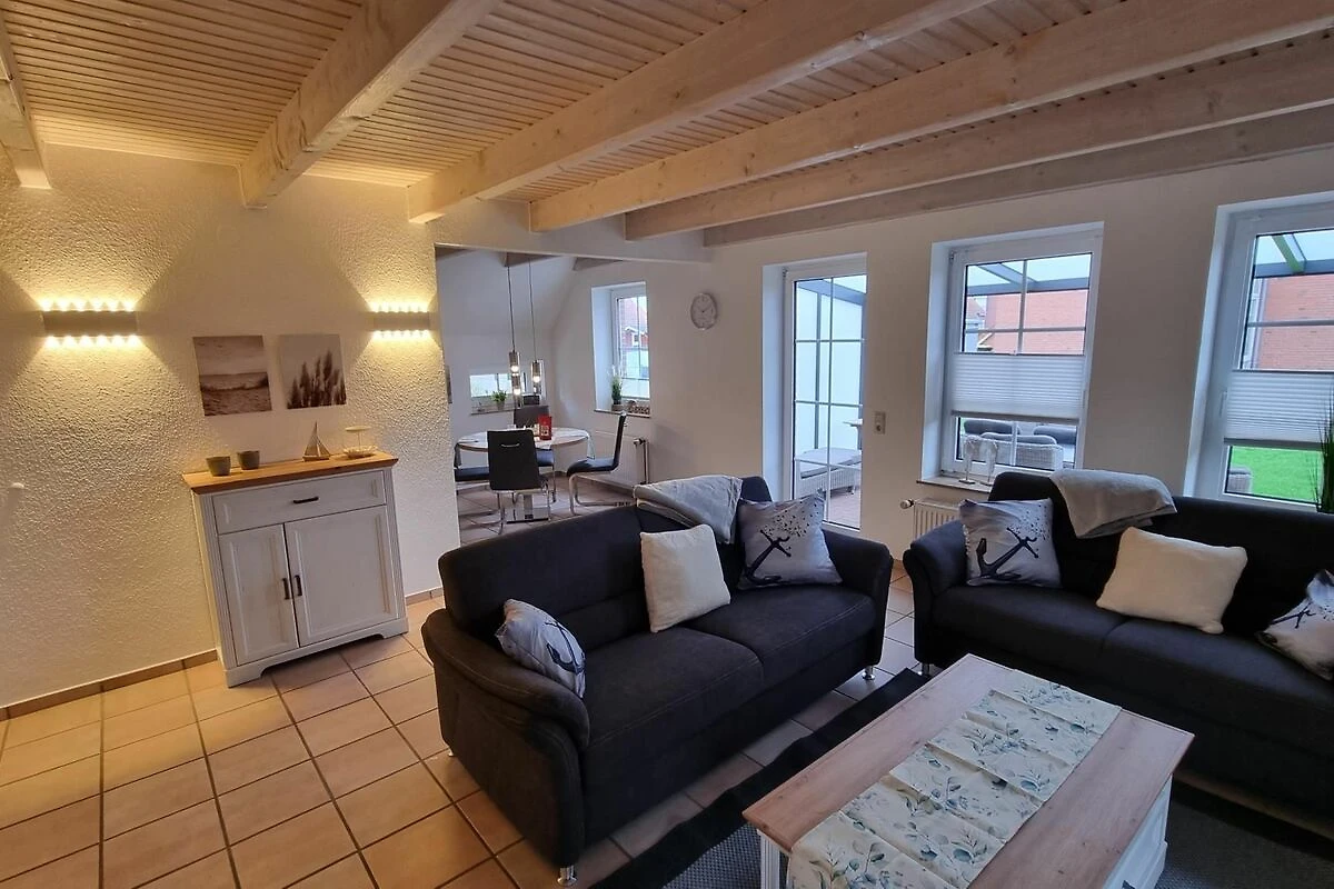 Der Wohnbereich ist freundlich gestaltet und lädt zu erholsamen Stunden nach einem Tag an der frischen Seeluft ein. Die Küche ermöglicht eine unkomplizierte Selbstversorgung während des Aufenthalts. Separate Schlafbereiche sorgen für Rückzugsmöglichkeiten und erholsame Nächte.
