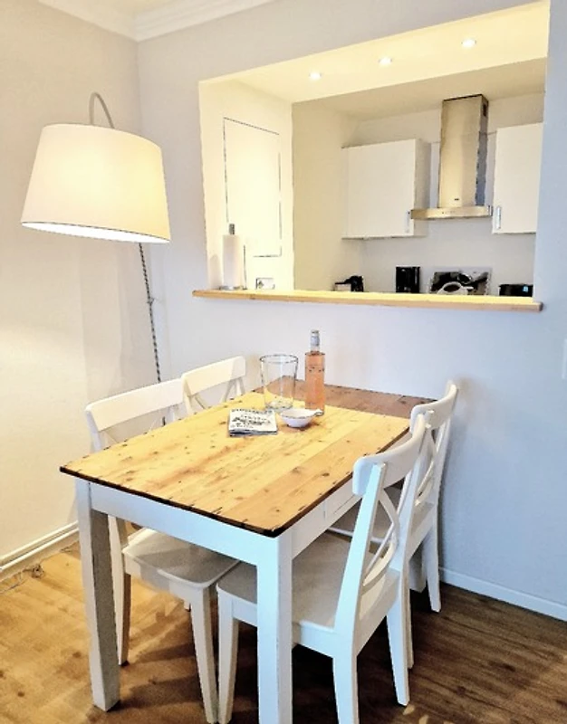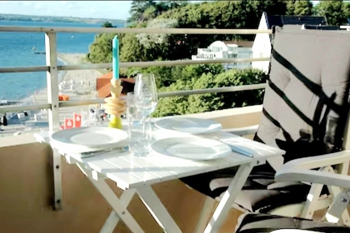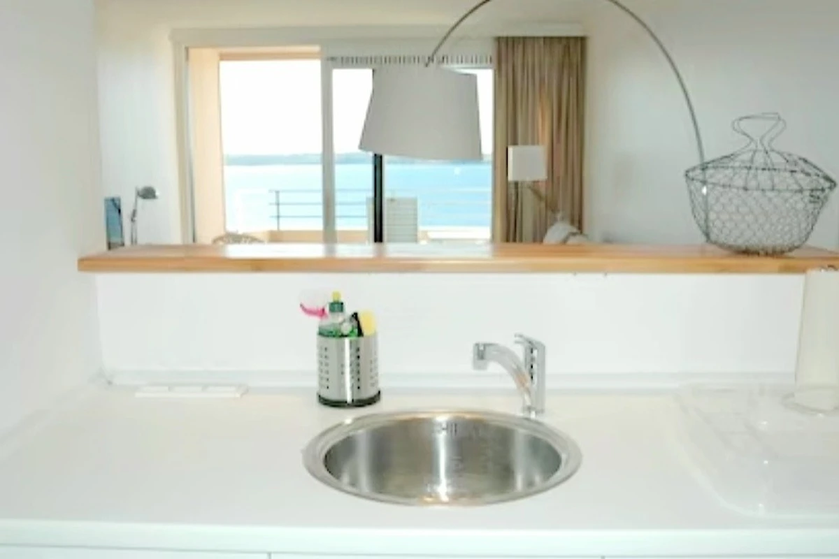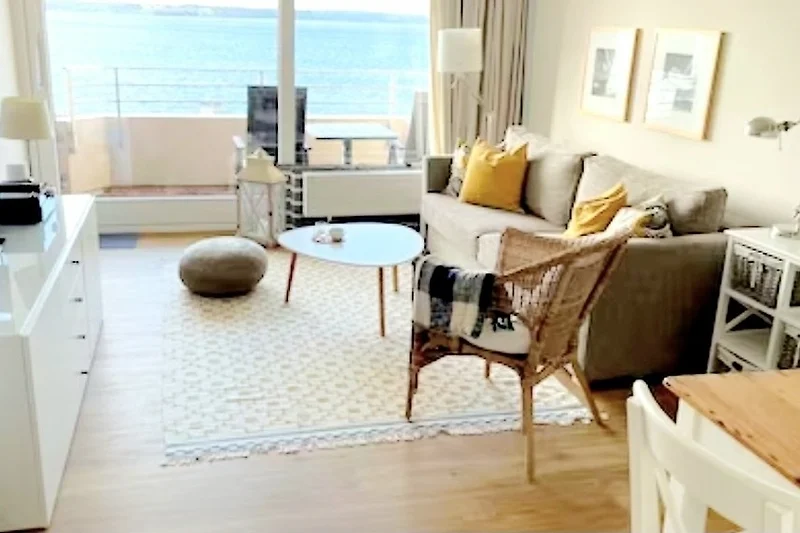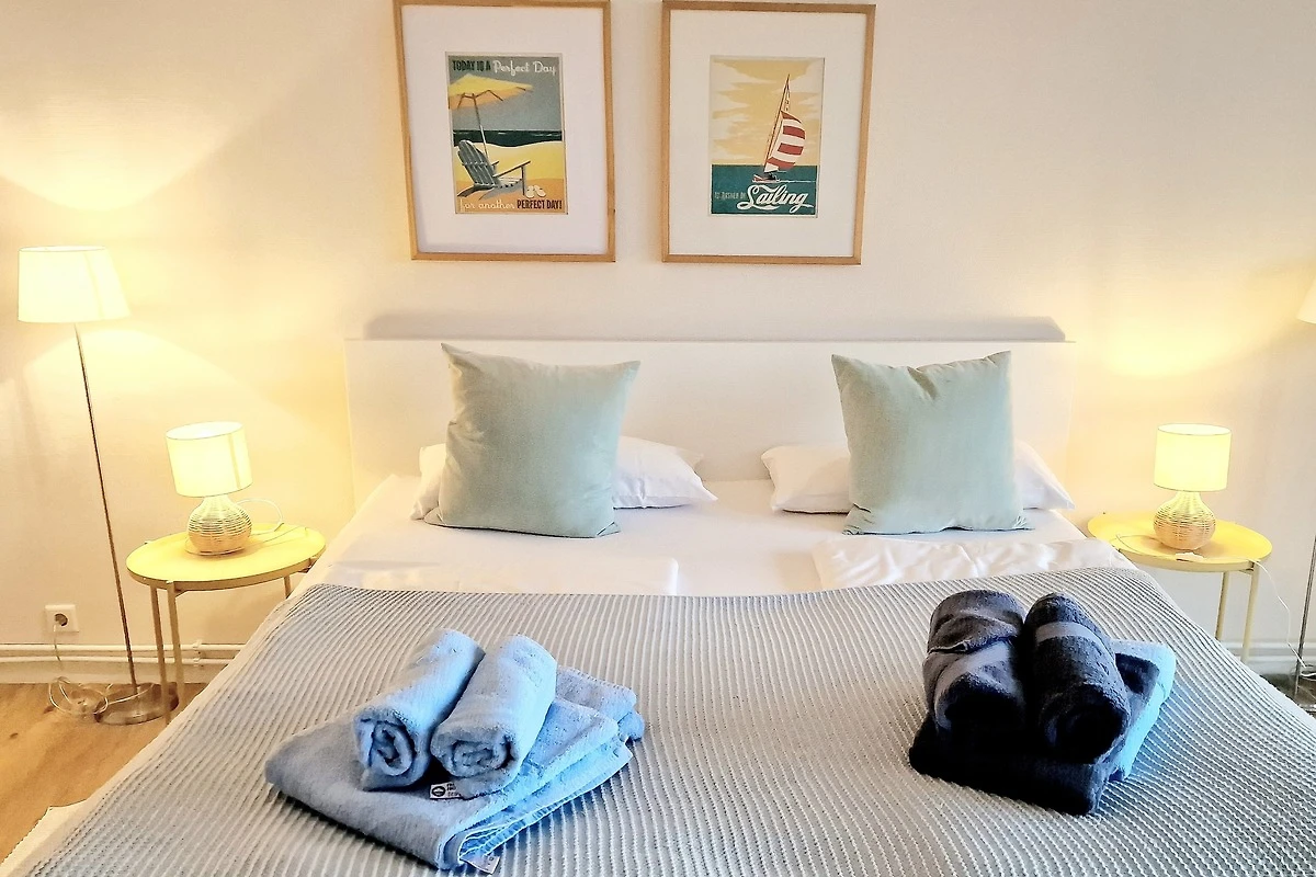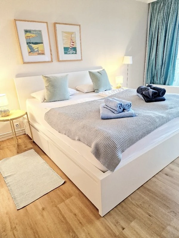 Das Schlafzimmer präsentiert sich in einem maritimen Stil, gehalten in Weiss und Türkis. Sowohl das Bett als auch die Matratzen sind brandneu. Die nagelneue Einbauküche ist komplett ausgestattet mit einem Geschirrspüler, einem Kühlschrank und einem Backofen mit Cerankochfeld. Von Ihrem Küchentresen aus können Sie den Blick ins Wohnzimmer geniessen und weiter auf die Förde schweifen lassen.