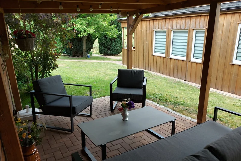 Im großzügigen Außenbereich des Ferienhauses finden Sie eine Sommerdusche zur Erfrischung, Sonnenliegen eine Terrasse mit Schatten spendenden Bäumen, ausgestattet mit Sonnenschirm, Gartenmöbeln, Grill und freien Blick in die Natur. Eine weitere überdachte Terrasse mit einer gemütlichen Sitzgruppe sorgt für entspannte Stunden. Für unsere kleinen Gäste ist ein Sandkasten mit Buddelspielzeug und eine Schaukel vorhanden. Bitte beachten Sie, dass das Rauchen im Haus nicht gestattet ist.