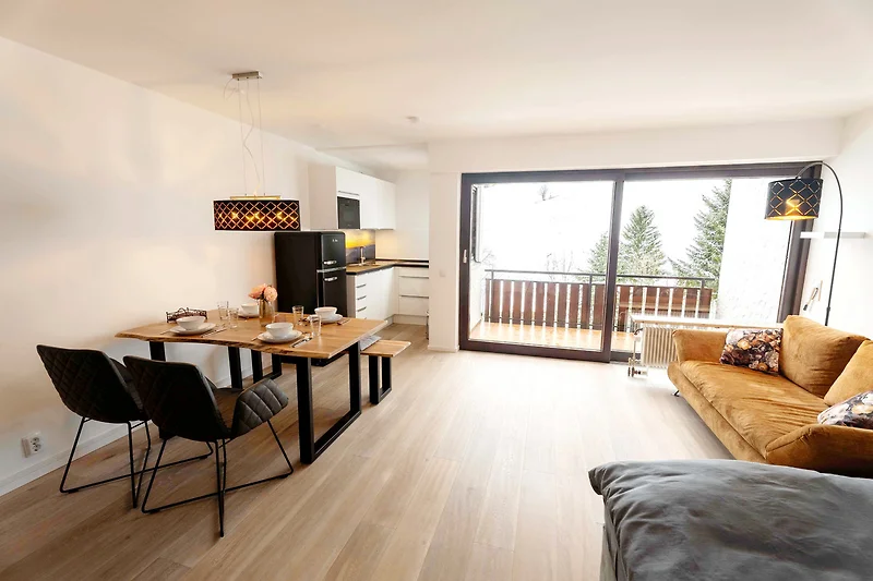 Der offene, ca. 29 m² Wohn-, Schlaf-, Essbereich verfügt über einen Essplatz, ein Sofa, einen TV und ein Boxspringbett (180x200). Über den Wohn-, Essbereich gelangen Sie auf den ca. 6 m² grossen Westbalkon, dieser bietet Ihnen einen Essplatz im Freien, saisonal einen Grill und eine Liegemöglichkeit.