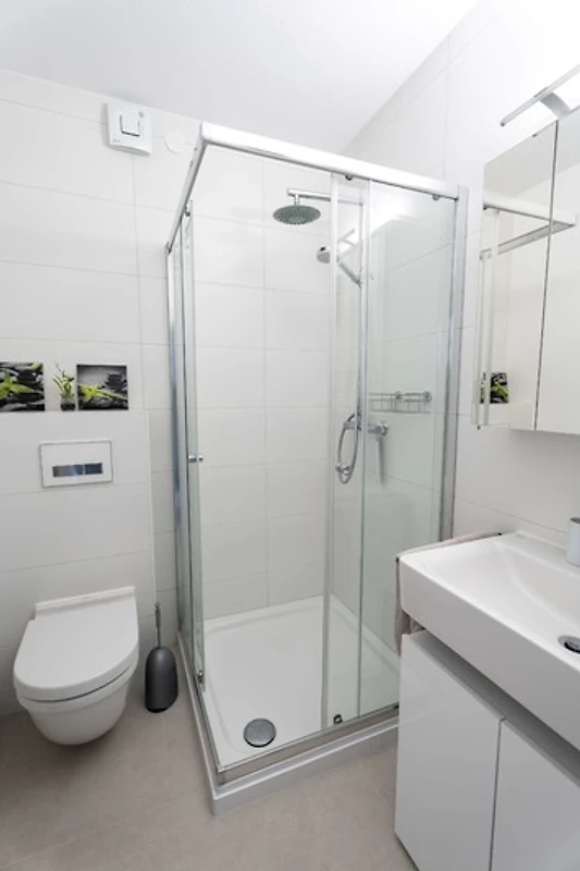 Im Badezimmer befindet sich das WC, eine Dusche und ein Föhn.