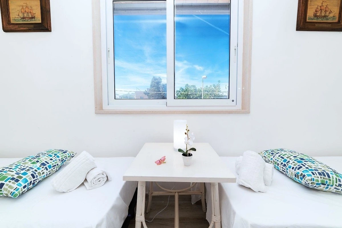 Die sehr einladenden und hellen Schlafzimmer sind wie folgt aufgeteilt: Wir finden 1 Doppelzimmer mit Kingsize-Bett und Kleiderschrank und 1 Schlafzimmer mit zwei Einzelbetten, immer mit angeschlossenem Kleiderschrank, ausserdem gibt es verschiedene massgefertigte Fächer, um alle Ihre persönlichen Gegenstände unterzubringen.