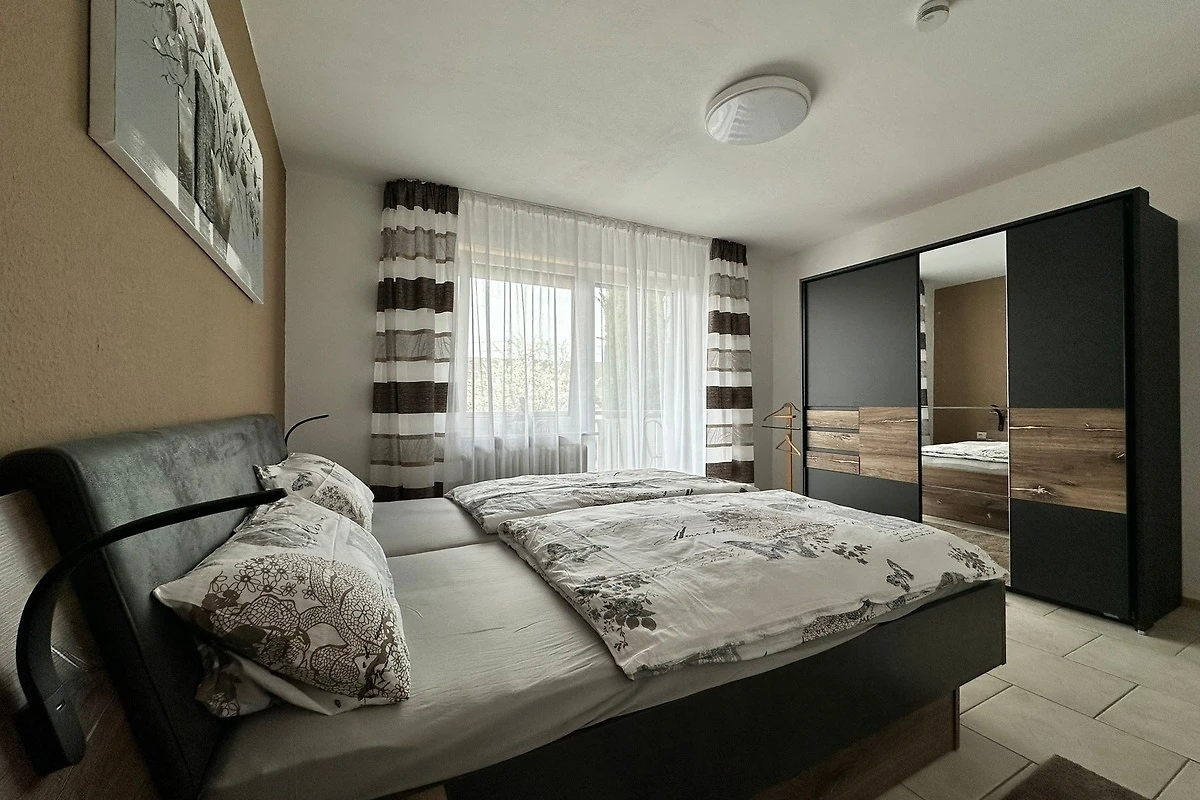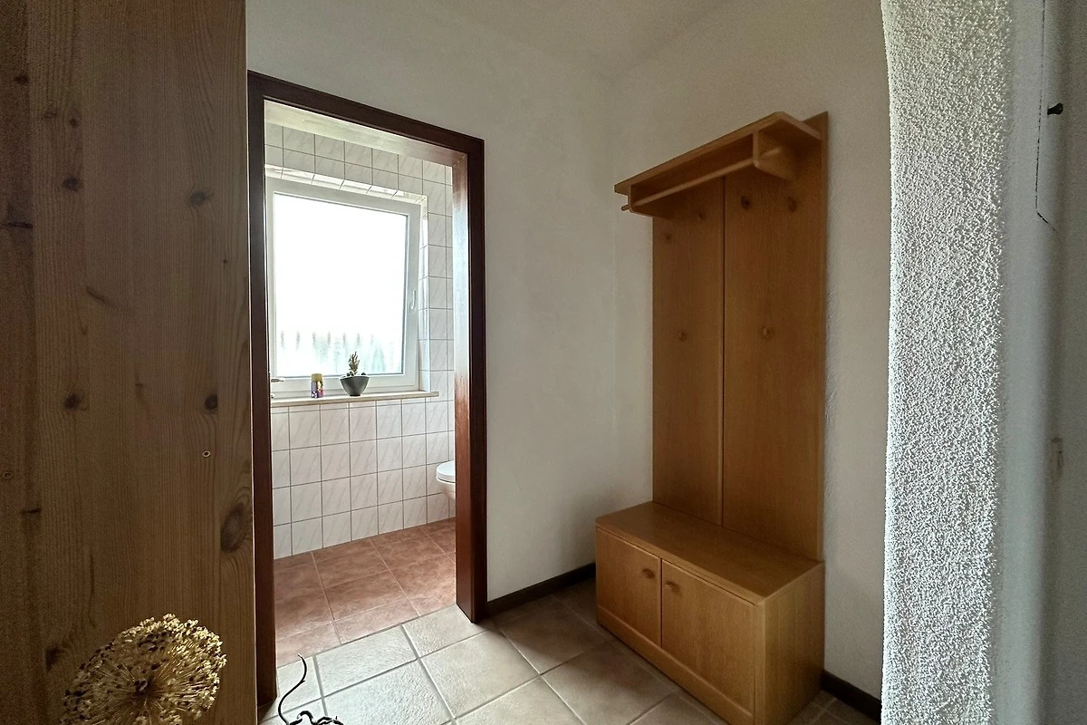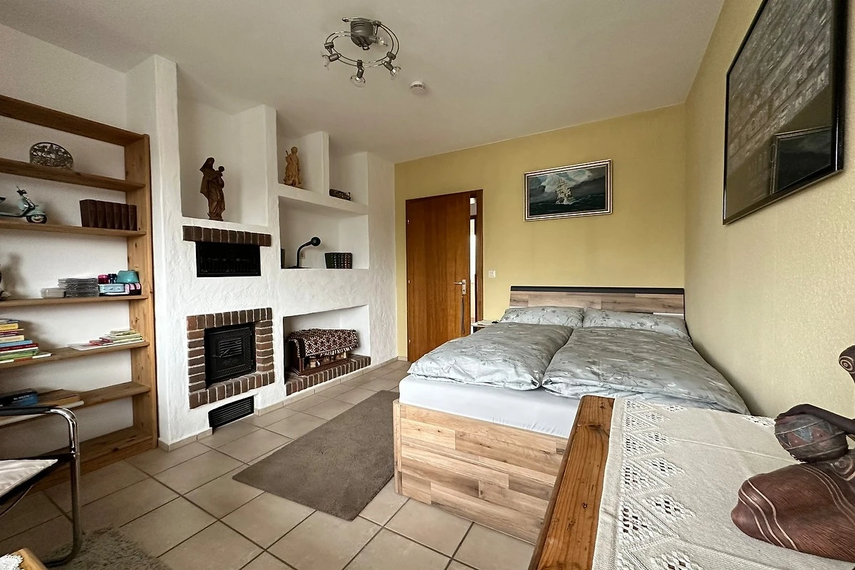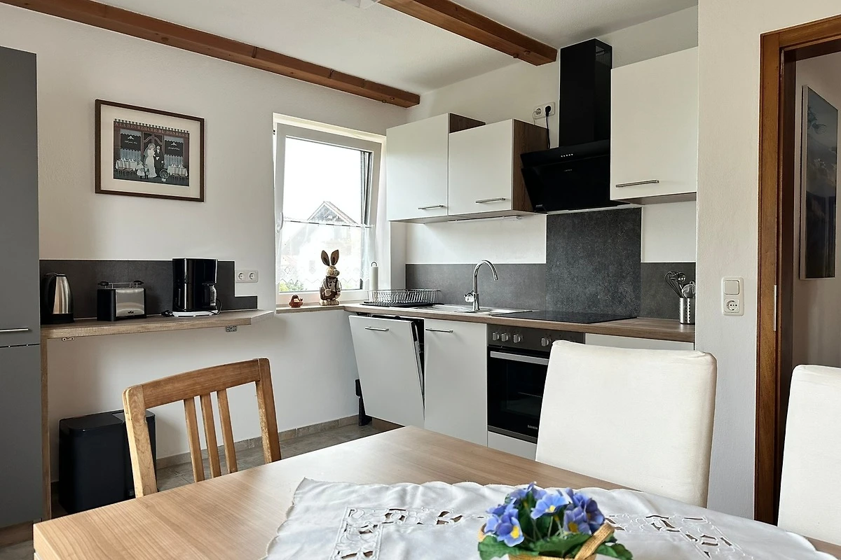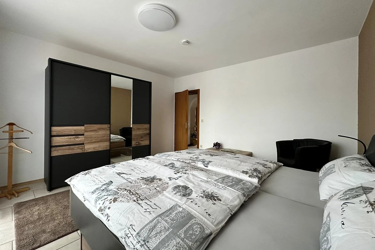 Gemütliche, komplett neu möblierte Ferienwohnung für bis zu 4 Personen, ca. 88 qm, im 1. Stock. Die Wohnung besteht aus einem Wohnzimmer, Küche mit Essbereich, 1 Schlafzimmer mit Doppelbett (180 x 200) und 1 Schlafzimmer mit Doppelbett (140 x 200), neues Bad mit ebenerdiger Dusche und einem WC extra. Garten zum Spielen für Ihre Kinder steht zur Verfügung. Überdachter möblierter Balkon.