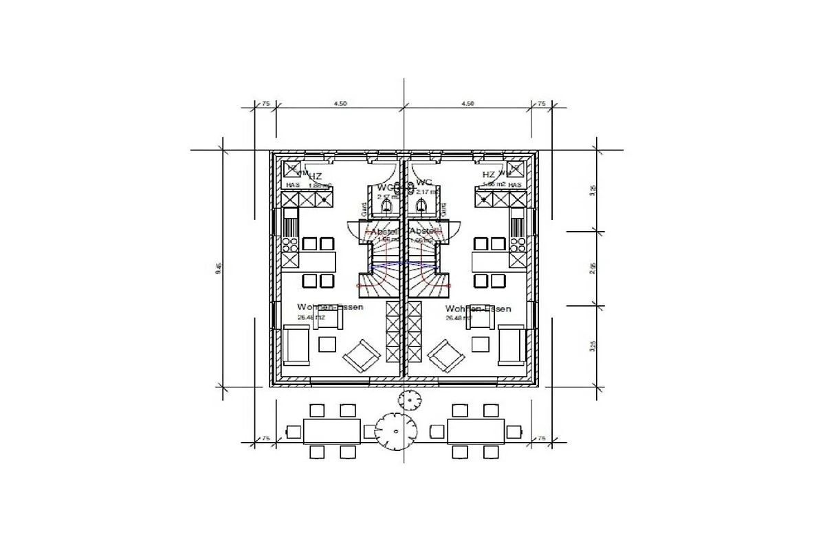 Parterre: (Eingangshalle(, , Heizung), Küche(, Radio, Kochplatte, Wasserkocher, Toaster, Kaffeemaschine, Backofen, Spülmaschine, Kühlschrank, Tiefkühlschrank, Heizung), Wohn/Esszimmer(, , , TV, Esstisch, Radio, Heizung, Hochstuhl), guest toilet(, Toilette, Waschbecken, Heizung), Abstellraum(, Waschmaschine, Bügelbrett, Trockenschrank))