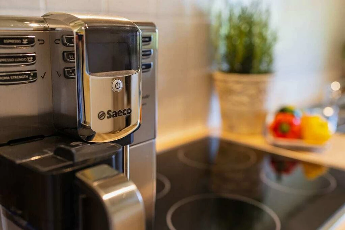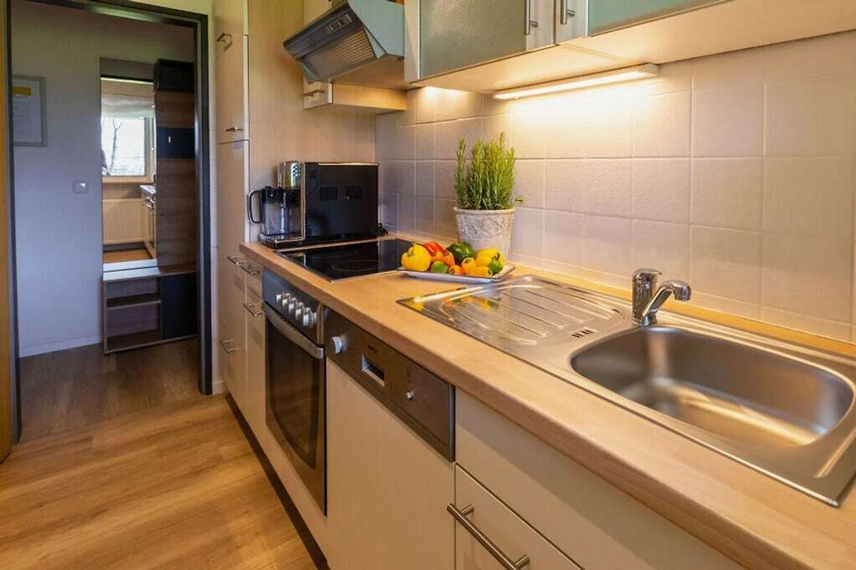 Komplett eingerichtete Küche mit E-Herd, Backofen, Geschirrspülmaschine, Kühlschrank, Tiefkühlschrank, Kaffeemaschine, Kaffeevollautomat, Toaster, Wasserkocher, Eierkocher, Grundausstattung an Verbrauchsmaterialien.