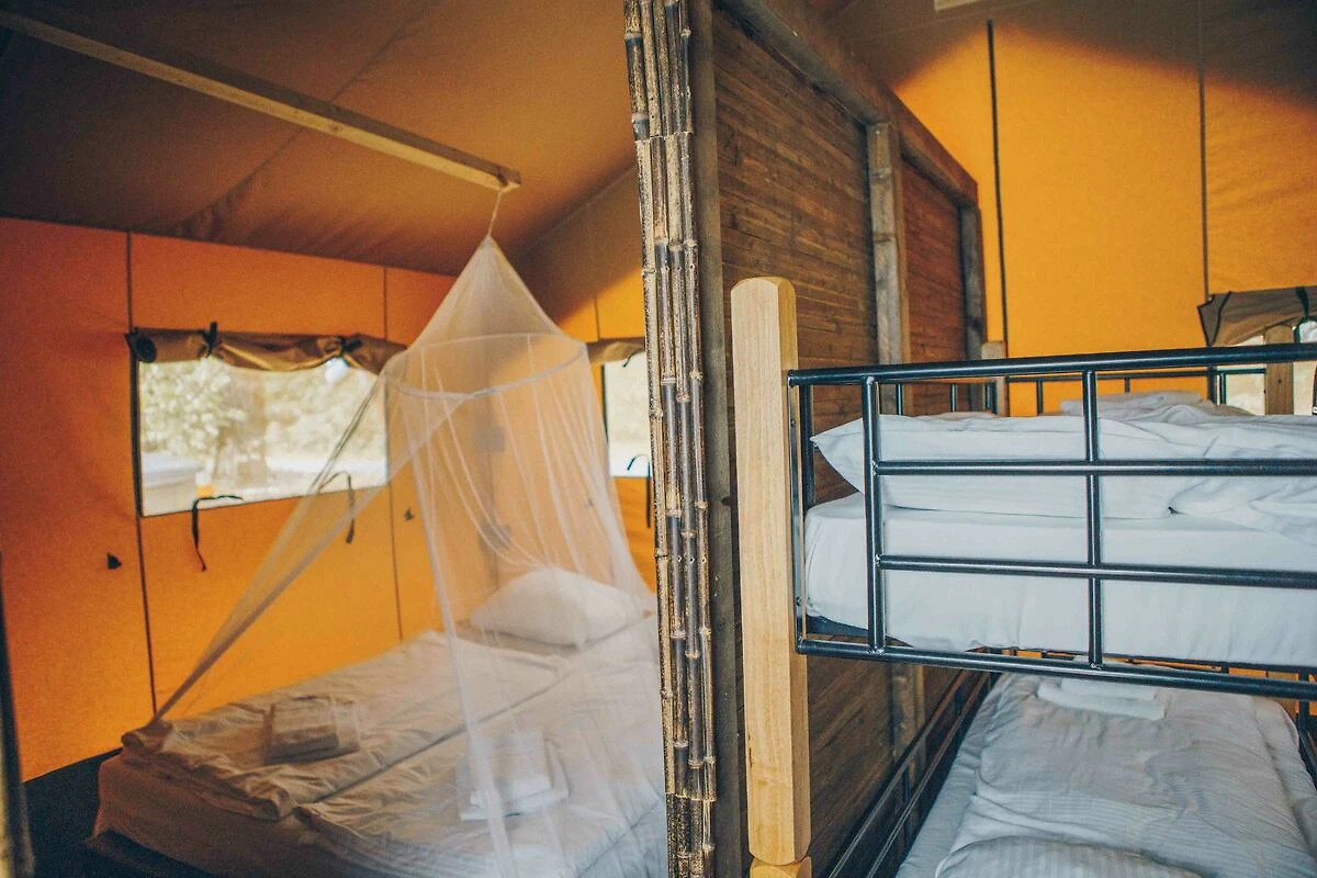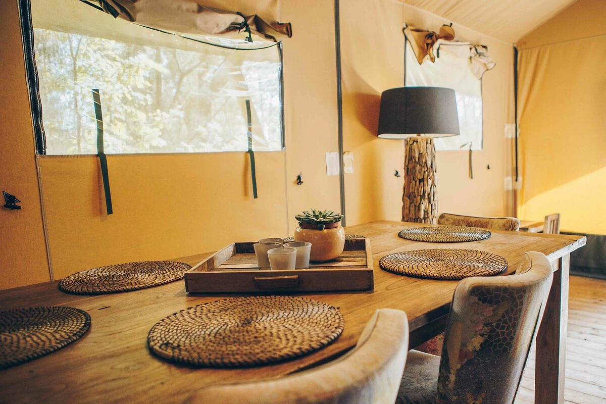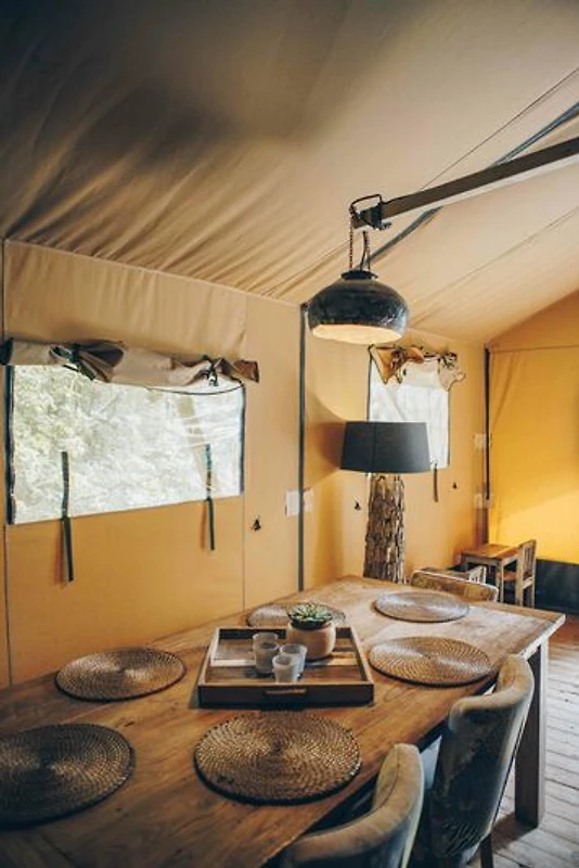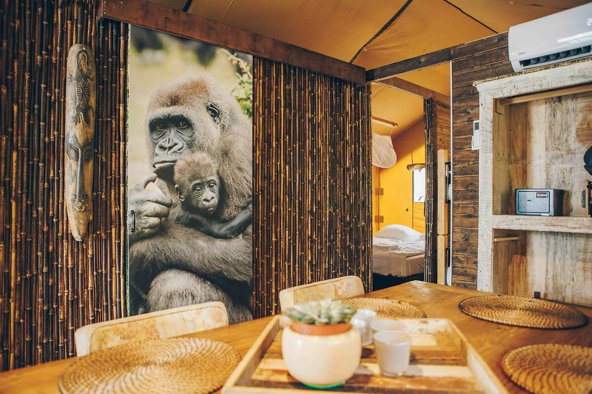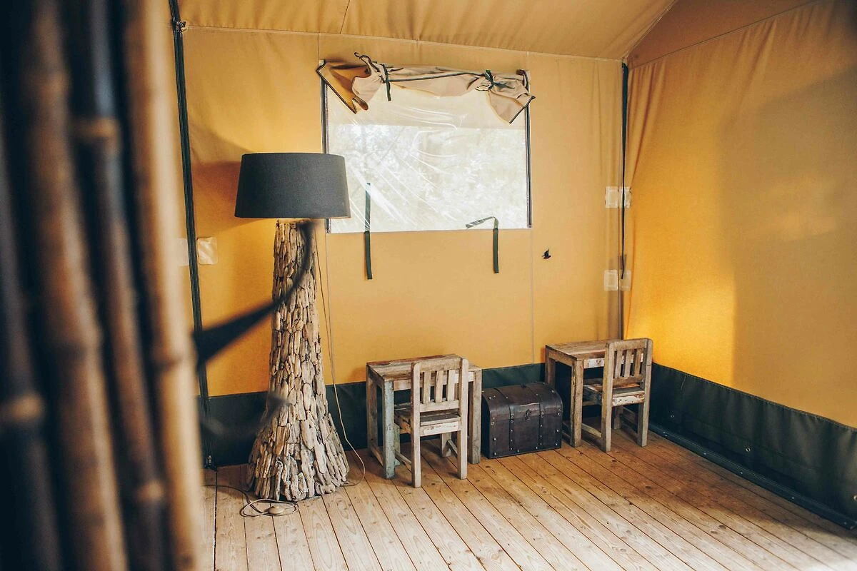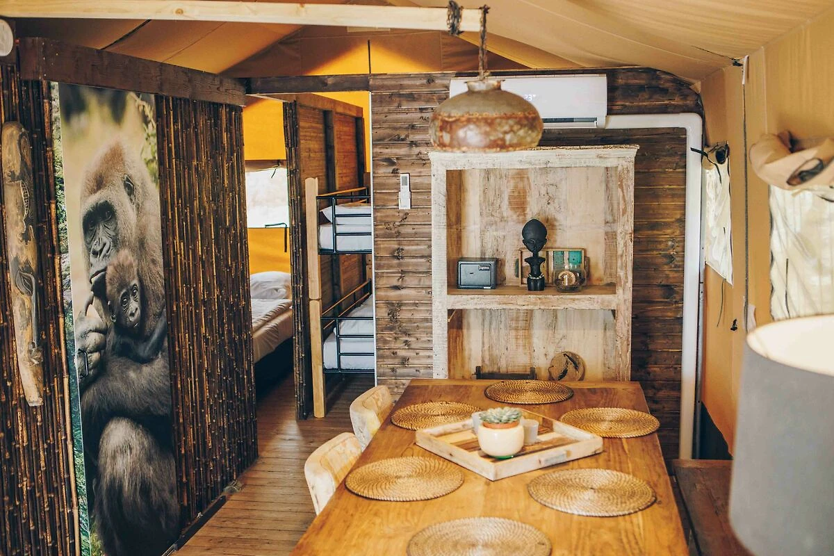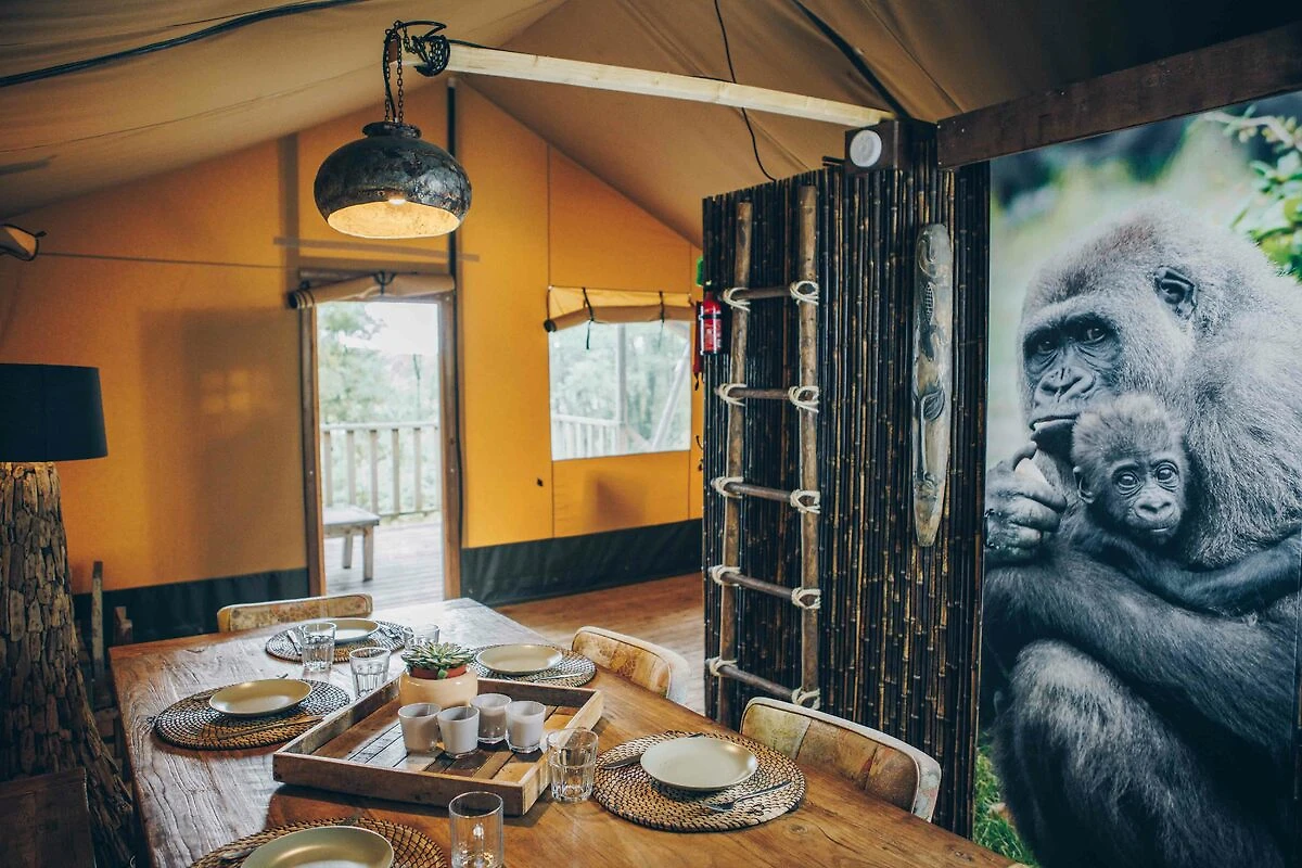 Tauchen Sie ein in eine Welt voller Safari-Feeling, mitten im Grünen. Unsere stimmungsvollen Glamping-Zelte für 5 Personen sind im afrikanischen Stil eingerichtet und jedes bietet ein einzigartiges Thema: Übernachten Sie zum Beispiel zwischen Nashörnern, Gorillas, Nilpferden oder Giraffen. Mit zwei Schlafzimmern – darunter ein Elternschlafzimmer mit Doppelbett und ein Kinderzimmer mit Einzel- und Etagenbett – ist das Zelt ideal für bis zu fünf Personen. Der Holzfussboden und die grosszügige Veranda sorgen für zusätzlichen Komfort und eine warme Atmosphäre.Komfort wie zu Hause – mitten in der Natur