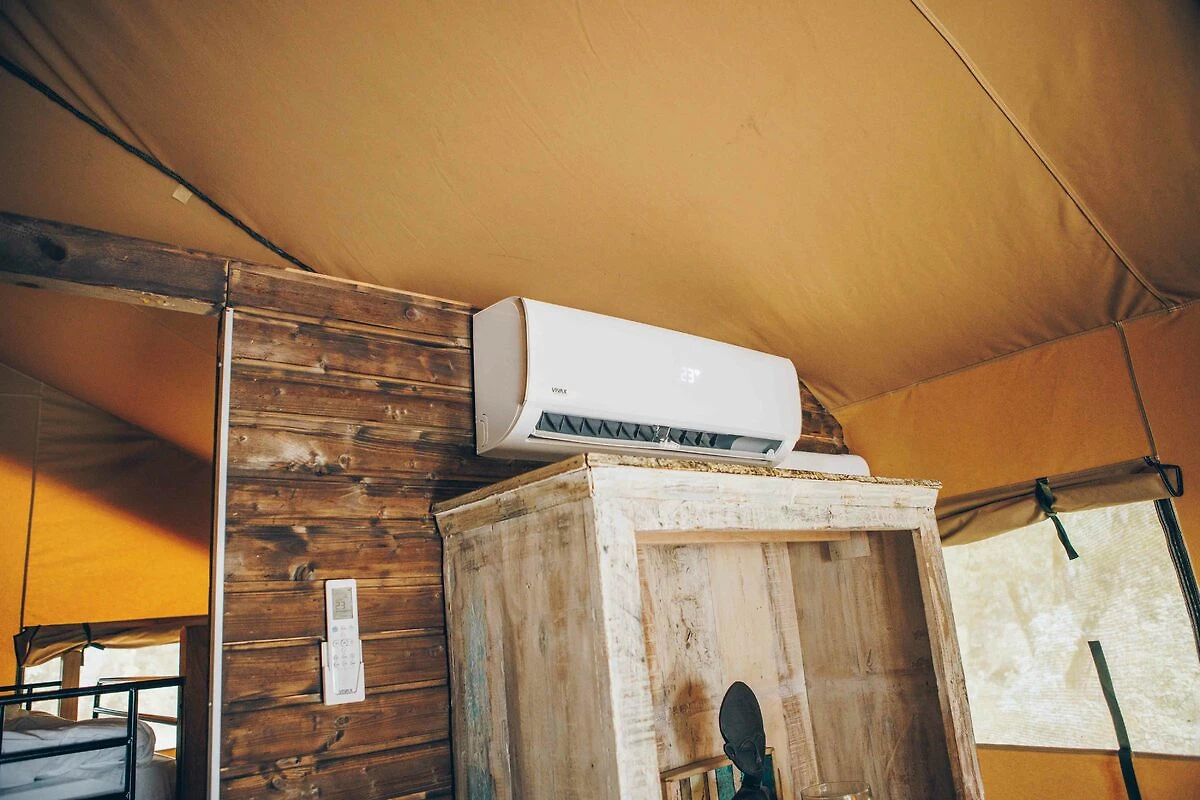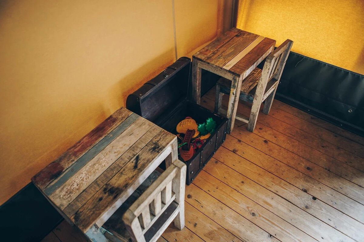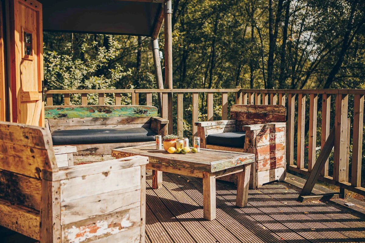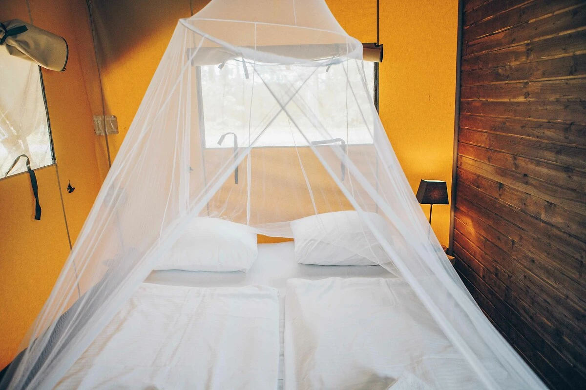 Die Glamping-Zelte bieten alles, was Sie für einen entspannten Aufenthalt brauchen. Sie verfügen über ein eigenes Bad mit Dusche, WC und Waschbecken, eine komplett ausgestattete Küche mit Nespresso-Maschine und ausreichend Geschirr sowie eine gemütliche Essecke. Draussen geniessen Sie lange Sommerabende auf der Holzveranda in der Loungemöbel-Garnitur mit weichen Kissen. Mit einer Wohnfläche von 50 bis 60 m² gibt es ausreichend Platz zum gemeinsamen Kochen, Spielen und Entspannen. Kostenloses WLAN und Klimaanlage (zum Kühlen und Heizen) machen den Aufenthalt noch angenehmer.Ferienpark und Umgebung