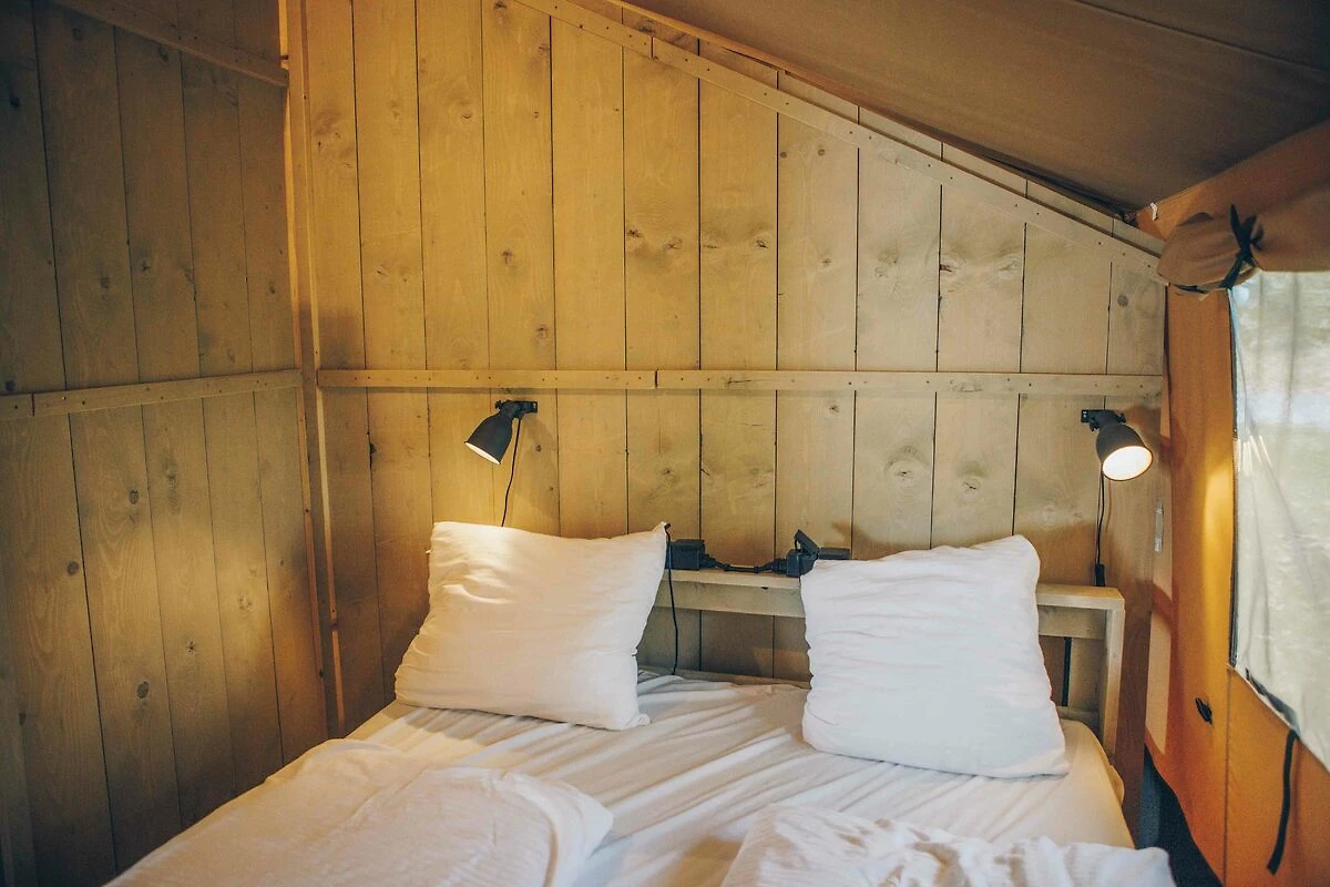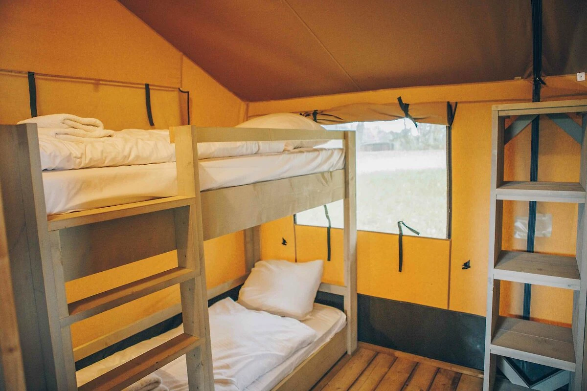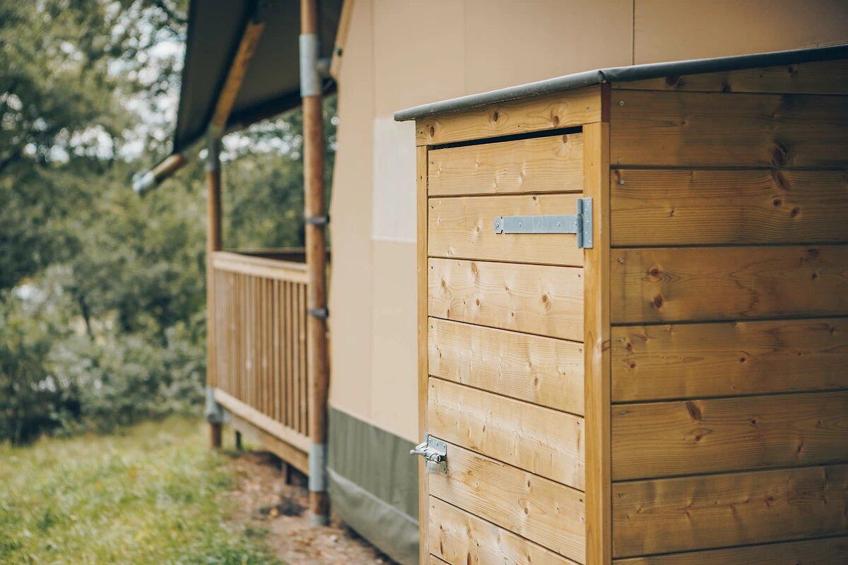 Geniessen Sie ein einzigartiges Urlaubserlebnis in unserem geräumigen Glamping-Zelt für bis zu 7 Personen. Mit drei separaten Schlafzimmern, bequemen Betten und komplett ausgestatteter Einrichtung erleben Sie den Charme des Campings, ohne auf Luxus und Komfort verzichten zu müssen. Die Glamping-Zelte sind für maximal 7 Personen eingerichtet und verfügen über 3 Schlafzimmer. Im Elternschlafzimmer befindet sich ein Doppelbett (mit Moskitonetz), im zweiten Schlafzimmer ein Einzelbett und ein Etagenbett und im dritten Schlafzimmer zwei Einzelbetten. Der Holzboden und die stimmungsvolle Einrichtung sorgen für eine warme, heimelige Atmosphäre.Stilvolles Leben im Freien auf der Veranda