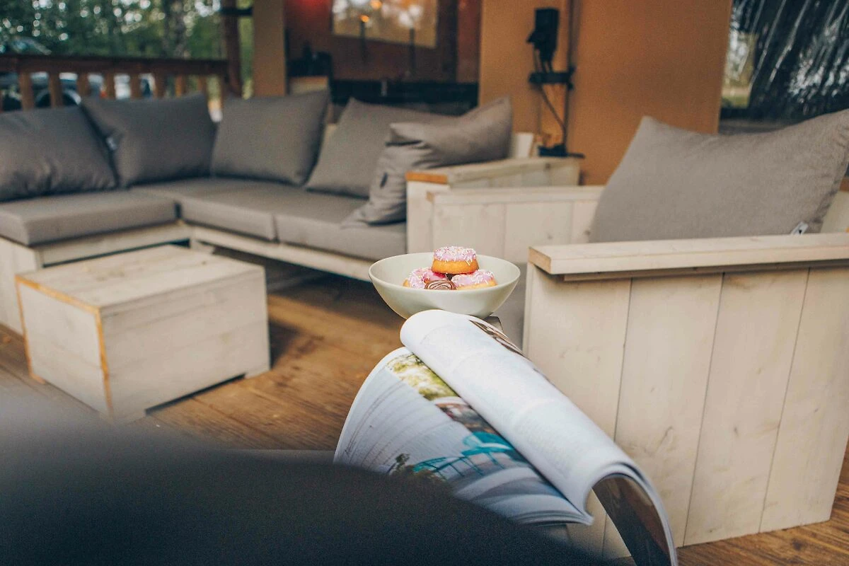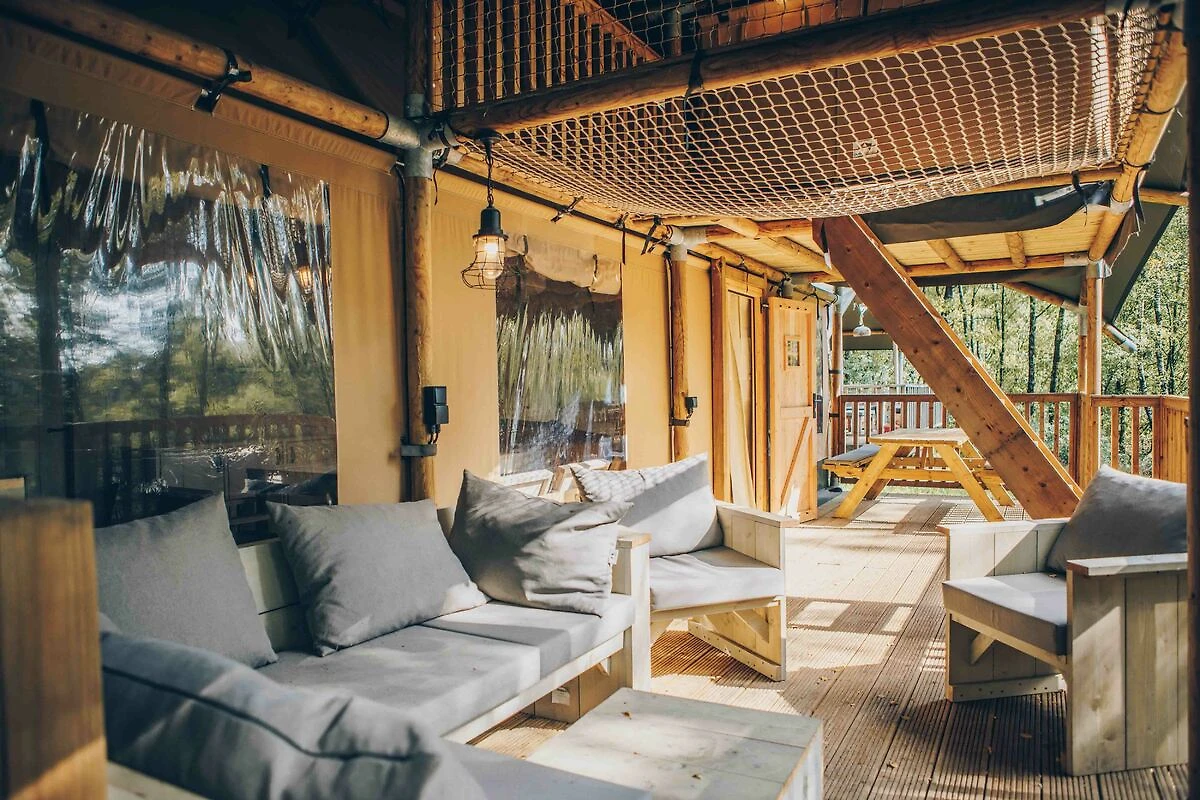 Prima. Lux, aber trotzdem campen. In einem Zelt, aber mit solider Holzausstattung. Die Veranda und Ausstattung des Zeltes.