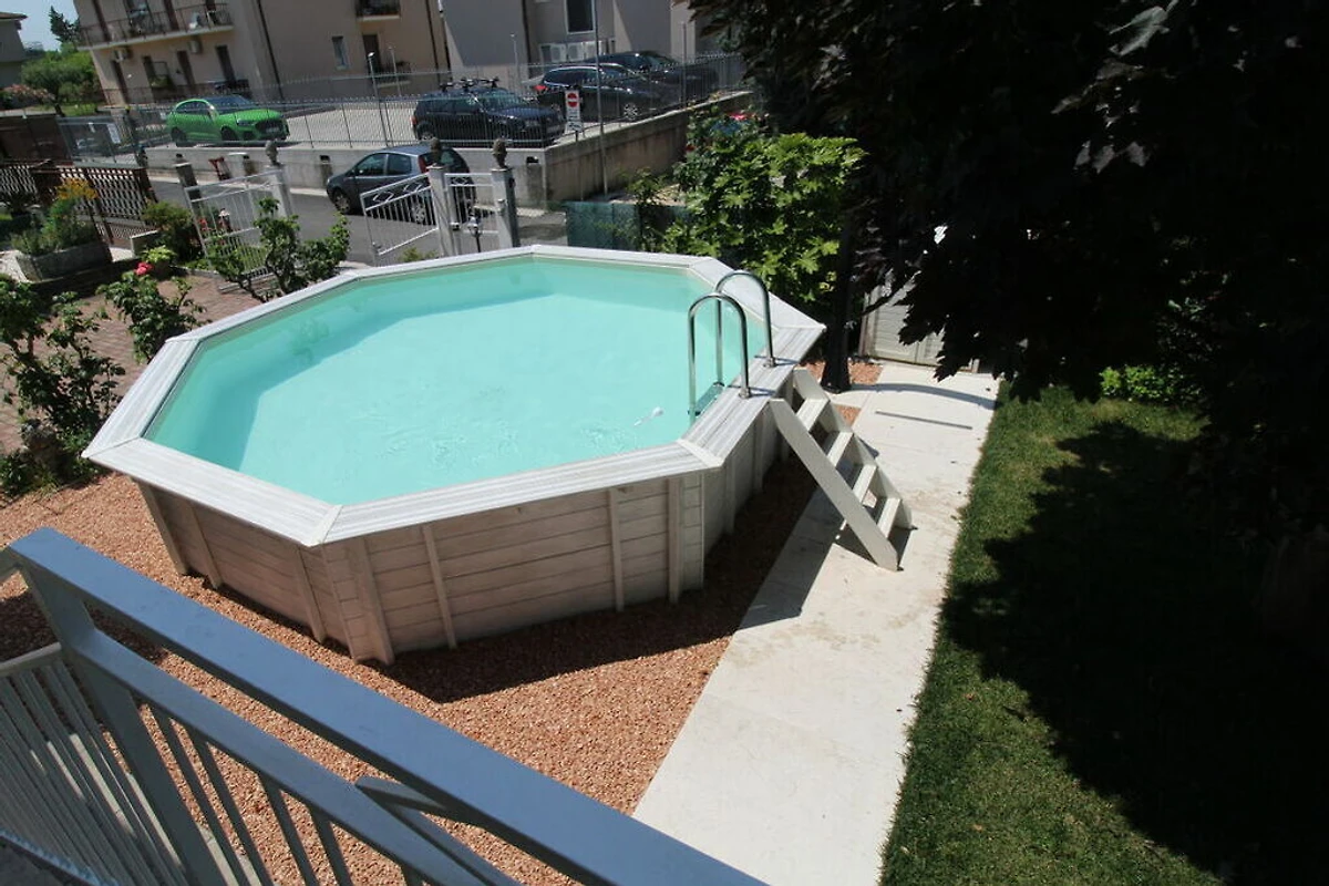 Pool (500x540cm) Garten mit Tisch, Stühlen, Sesseln und Sonnenliegen gemeinsam mit einer anderen Wohnung.