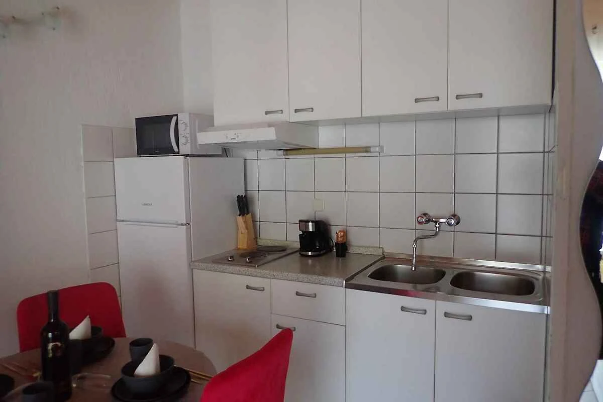 und führt über eine Aussentreppe direkt in den Windfang. Schlafzimmer (15 qm) mit 1 Doppelbett, 1 Zusatzbett auf Schlafsessel (nur für Kinder unter 11 Jahre geeignet), TV, Essecke (3 Plätze) und Zugang zum Balkon (Gartenmöbel, 1 Tisch, 3 Stühle). Kochnische (6 qm) mit Elektroherd (2 Platten), Dunstabzugshaube, Kühlschrank (100 l, Eisfach), Mikrowelle, Kaffeemaschine und elektrischem Wasserkocher. Bad (5 qm) mit Badewanne mit Duscheinrichtung, Waschmaschine, 1 Waschbecken und WC.