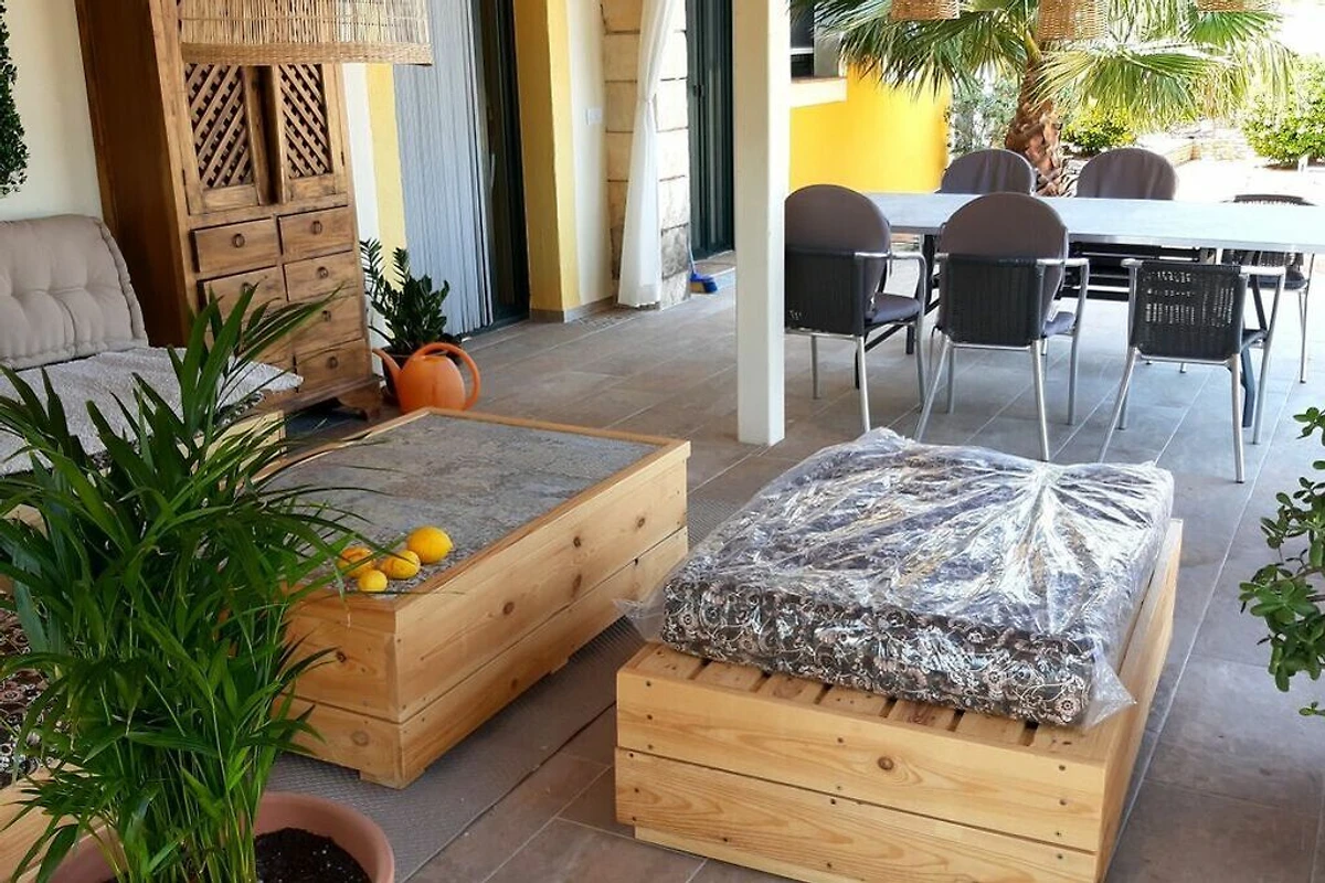 Nebengebäude: (Wintergarten/Veranda, Balkon oder Terrasse, Garten(Liegen, Pool))