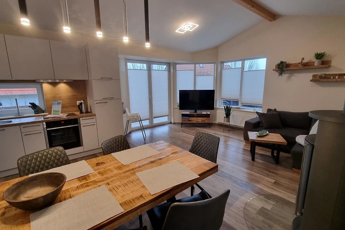Die Betten in beiden Schlafzimmern sowie der Ess- und Couchtisch sind alle komplett aus Massivholz gefertigt, der 55" grosse Fernseher mit Sky Sendern lädt zum Verweilen auf dem Sofa ein. Dieses lässt sich ausziehen, sodass die gesamte Familie zum Kuscheln darauf Platz findet.