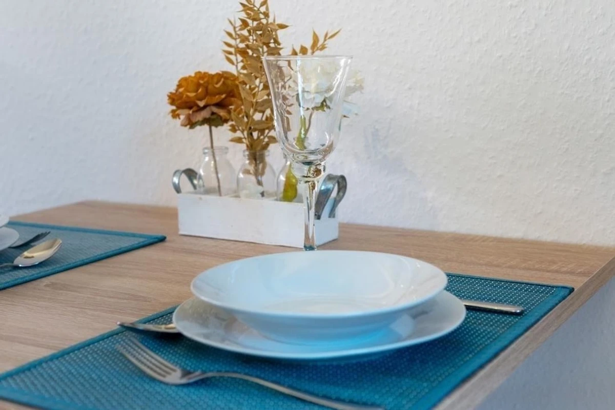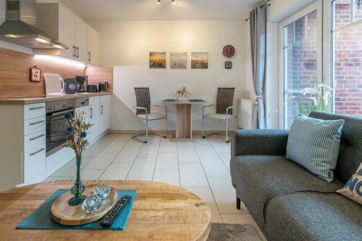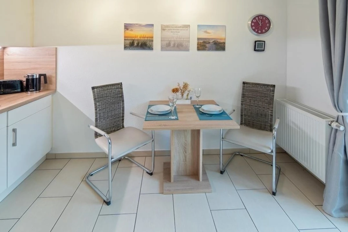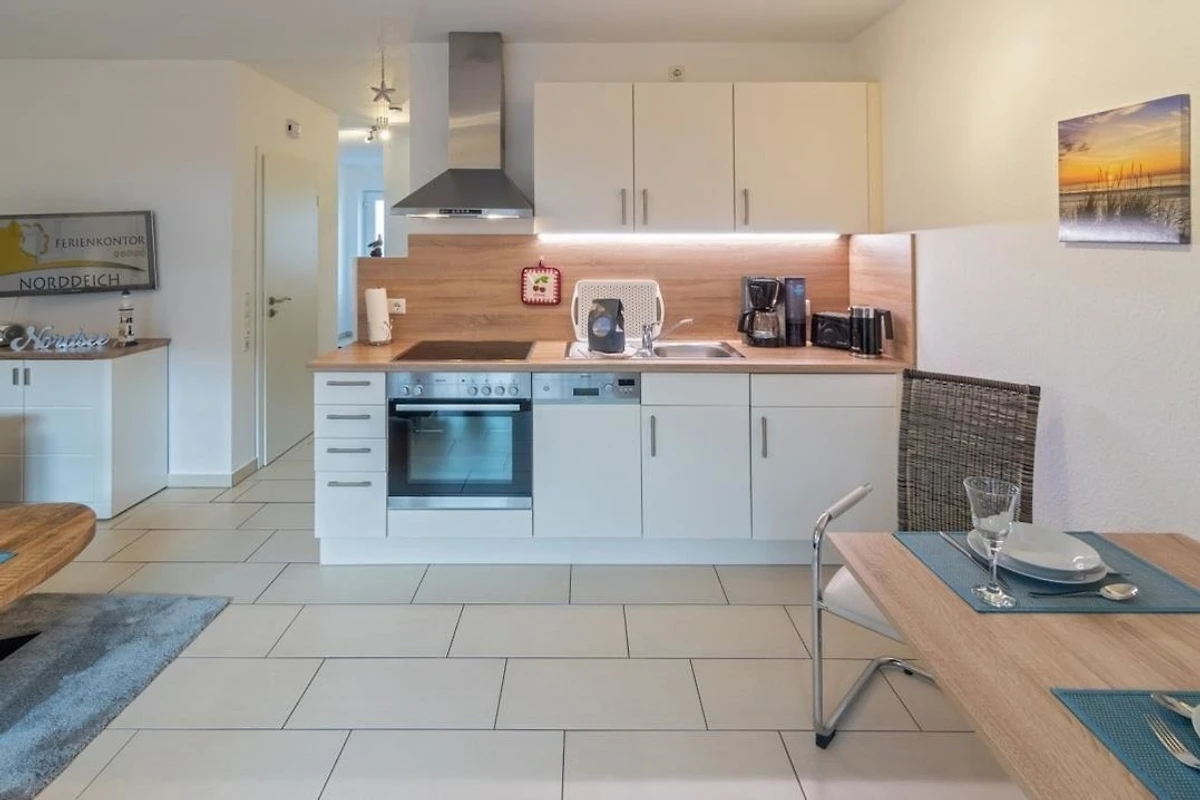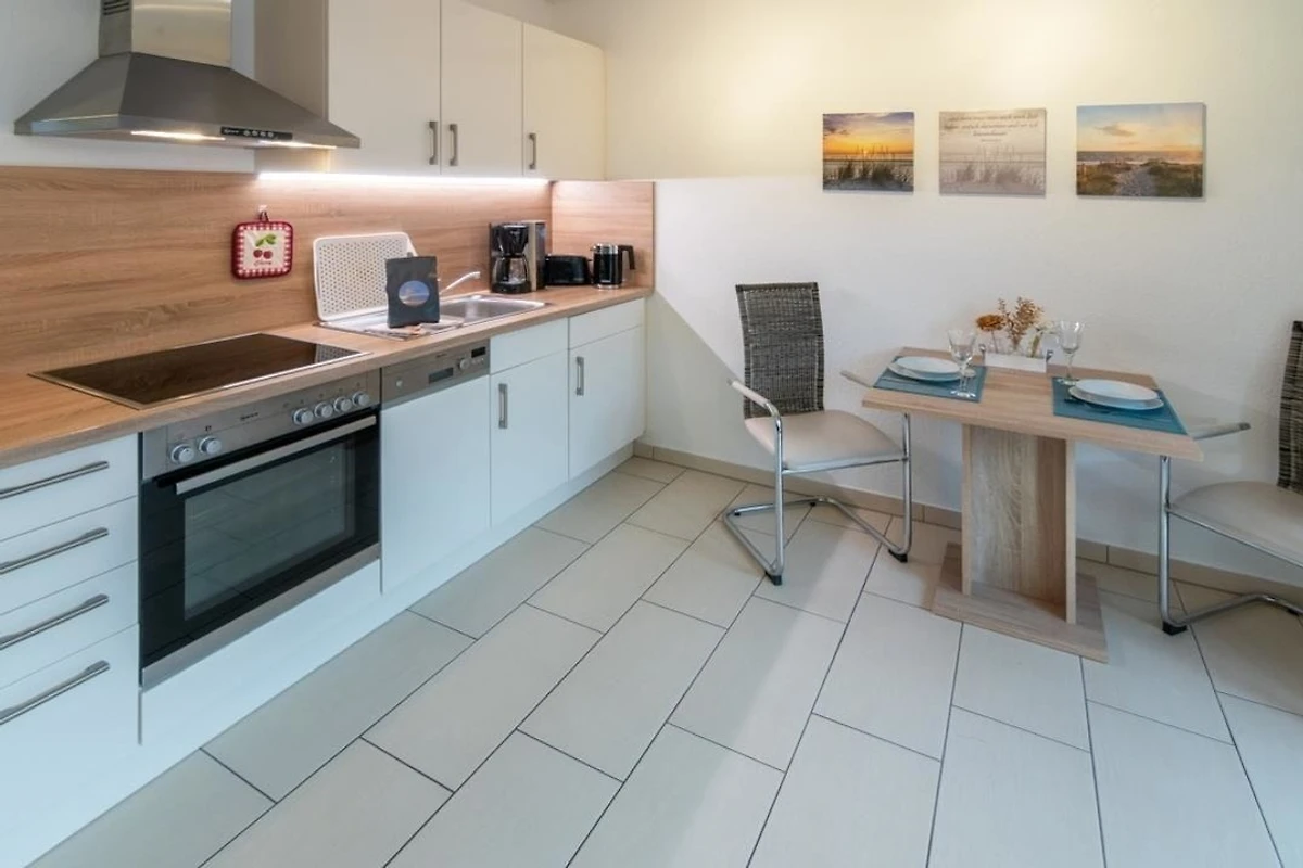 Die modern eingerichtete Küche rundet das Gesamtbild dieses offenen Raumes ab. Hier finden Sie einen Vier-Platten-Herd mit Backofen, einen Kühlschrank, eine Mikrowelle und eine Spülmaschine. Natürlich sind auch eine Kaffeemaschine und ein Toaster vorhanden. Ausgestattet mit Geschirr und Gläsern können Sie an einem Tisch mit zwei Stühlen gemütlich Ihren Kaffee oder Tee trinken und ein Stück Torte von einem der heimischen Bäcker oder Ihr selbst zubereitetes Essen geniessen, wenn Sie einmal keine Lust haben auszugehen.