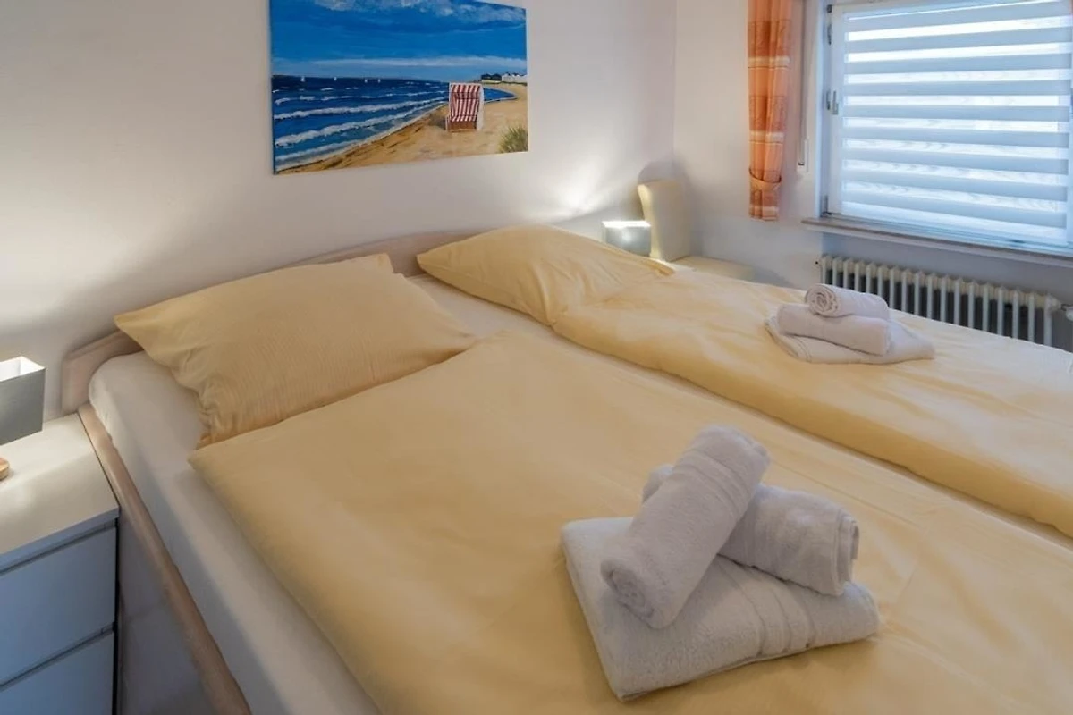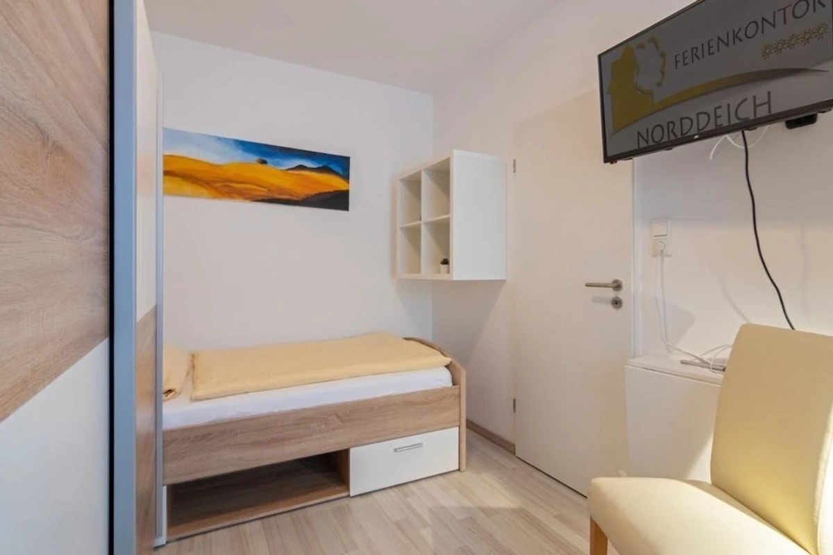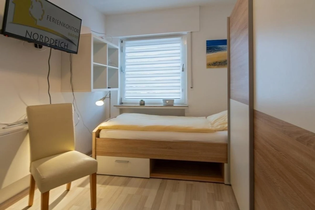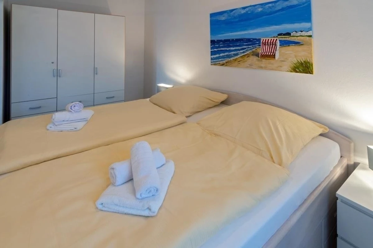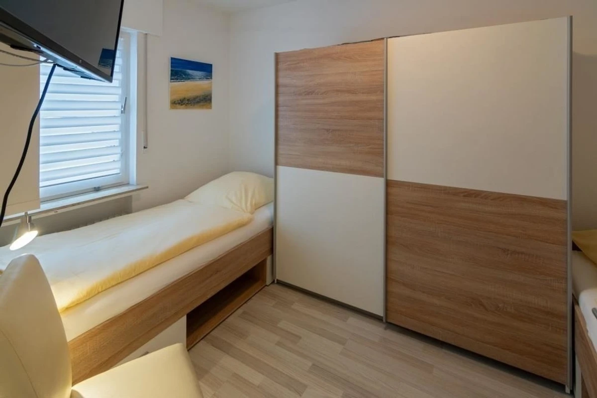 Im zweiten Schlafraum befinden sich zwei Einzelbetten (90 × 200), ebenfalls ein Kleiderschrank und zusätzlich noch TV-Gerät, um vom Bett aus gemütlich fernzusehen.