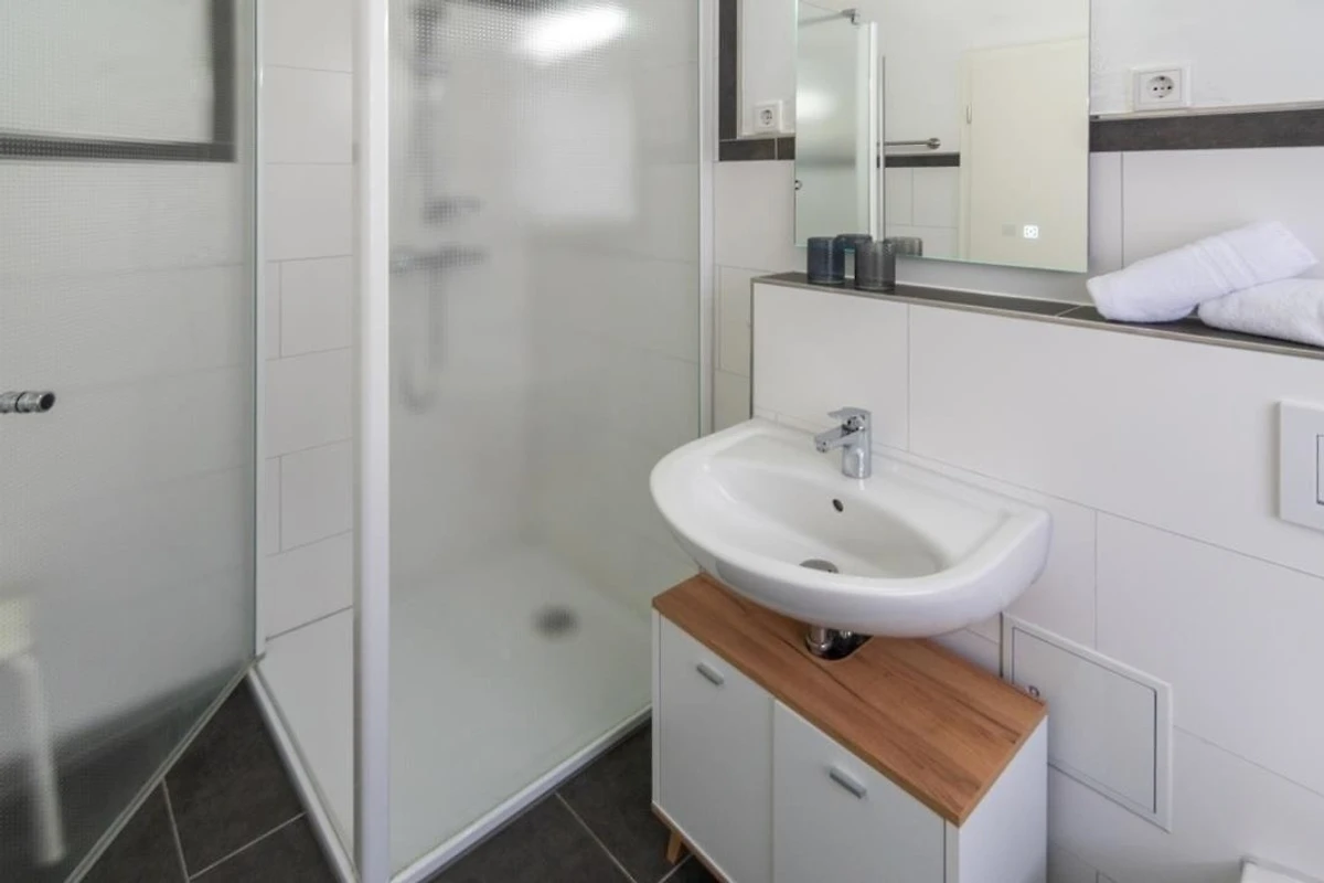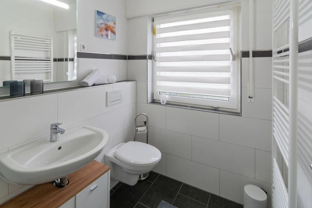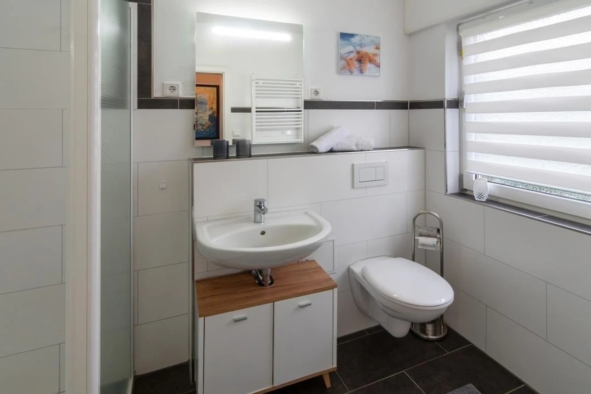 Das moderne Tageslicht Badezimmer ist gefliest und verfügt über eine bodennahe Dusche, einem WC, Waschbecken mit Unterschrank für Ihre Hygieneartikel und einem beleuchtetem Spiegel.