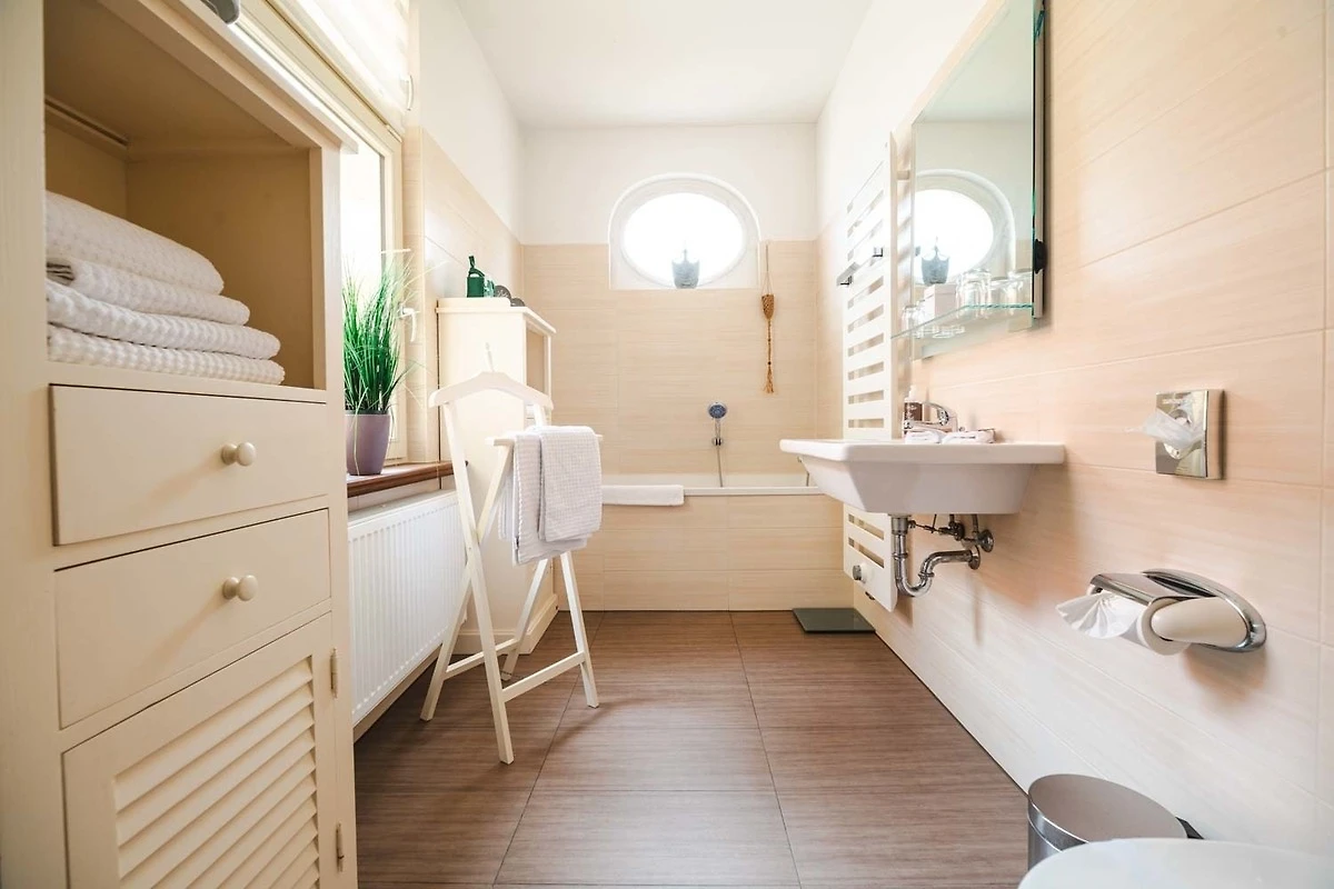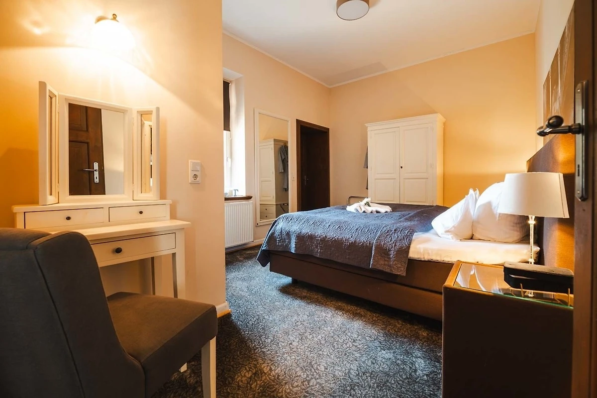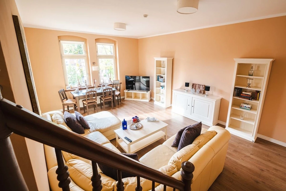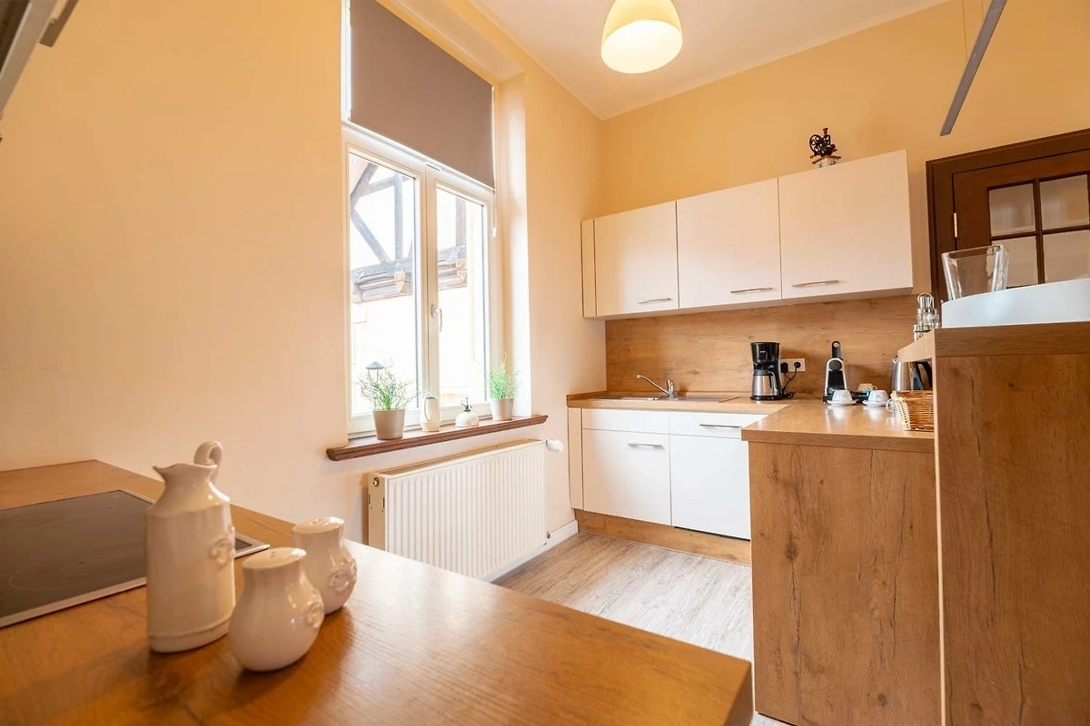 Auf einer Wohlfühlfläche von 120 qm erwartet Sie ein wunderschöner Blick auf das malerische Quedlinburg. Die Besonderheit in diesem Appartement ist das grosszügige Wohnzimmer mit Essbereich und Zugang zur kleinen Terrasse, so finden auch Freunde oder Familie einen Platz zum verweilen.