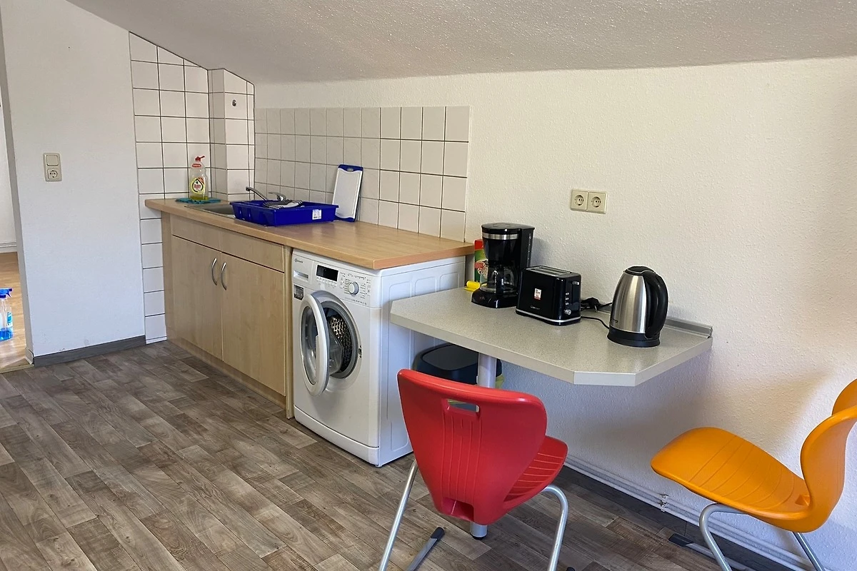 Im Dachgeschoss befindet sich eine vollausgestattete Gemeinschaftsküche mit Waschmaschine (+ Wäscheständer und Bügeleisen) und ein Wohn- Esszimmer mit gemütlichem Sofa und TV.