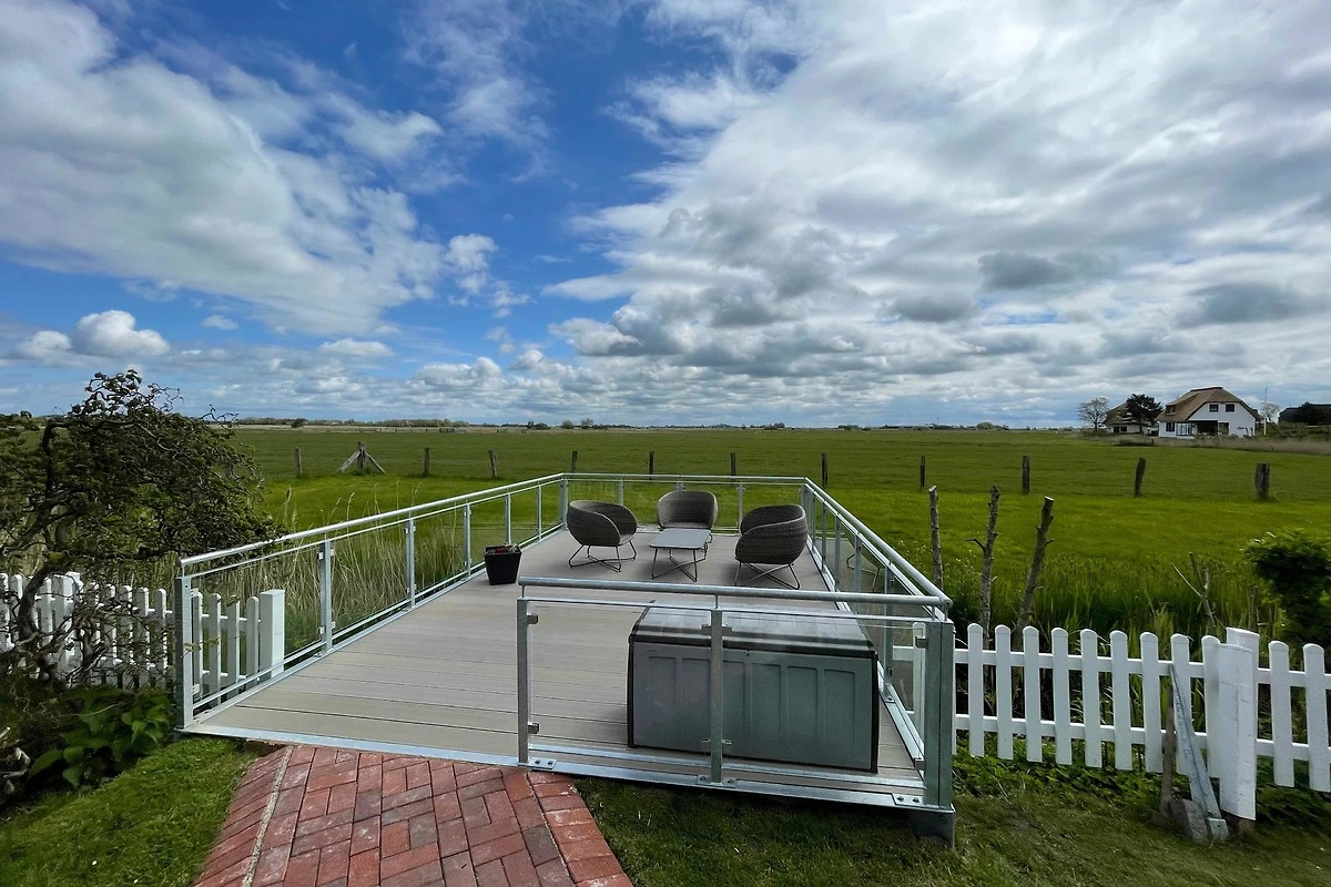 Auf dem grossen sonnigen Balkon mit Gartenmöbeln können sie hervorragend Frühstücken oder einfach den Urlaub im eigenen Strandkorb geniessen. In dieser besonderen Atmosphäre fühlt sich jeder richtig wohl. Entspannen Sie im wunderschönen Garten mit Blick auf die nordfriesische Wiesenlandschaft. Gerne dürfen sie auch die zahlreichen weiteren Sitzmöglichkeiten, Strandkörbe und Ruheoasen im gesamten Garten nutzen. Natürlich gibt es auch einen Grillplatz für gesellige Stunden.