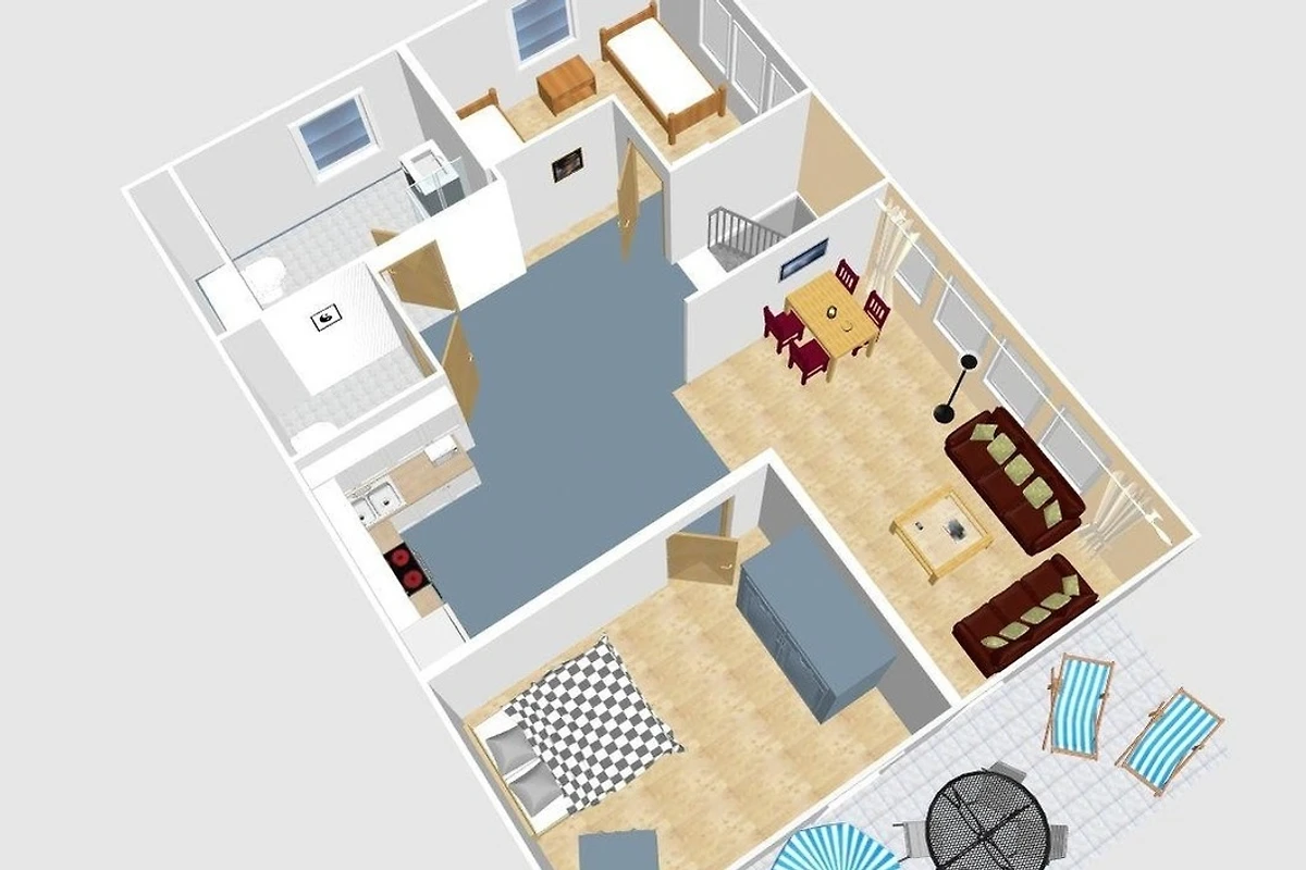 Ihr gemütliches Ferienhaus verfügt über 2 geräumige Schlafzimmer.Im grosszügigen kombinierten Wohn- und Küchenbereich bereiten Sie Köstlichkeiten zu oder machen es sich einfach gemütlich. Starten Sie entspannt in den Tag im schönen Badezimmer, ein Gäste WC erhöht Ihren Wohnkomfort.Ihr sonniger Süd-Balkon mit Strandkorb und Gartenmöbeln, lädt zum entspannen ein.