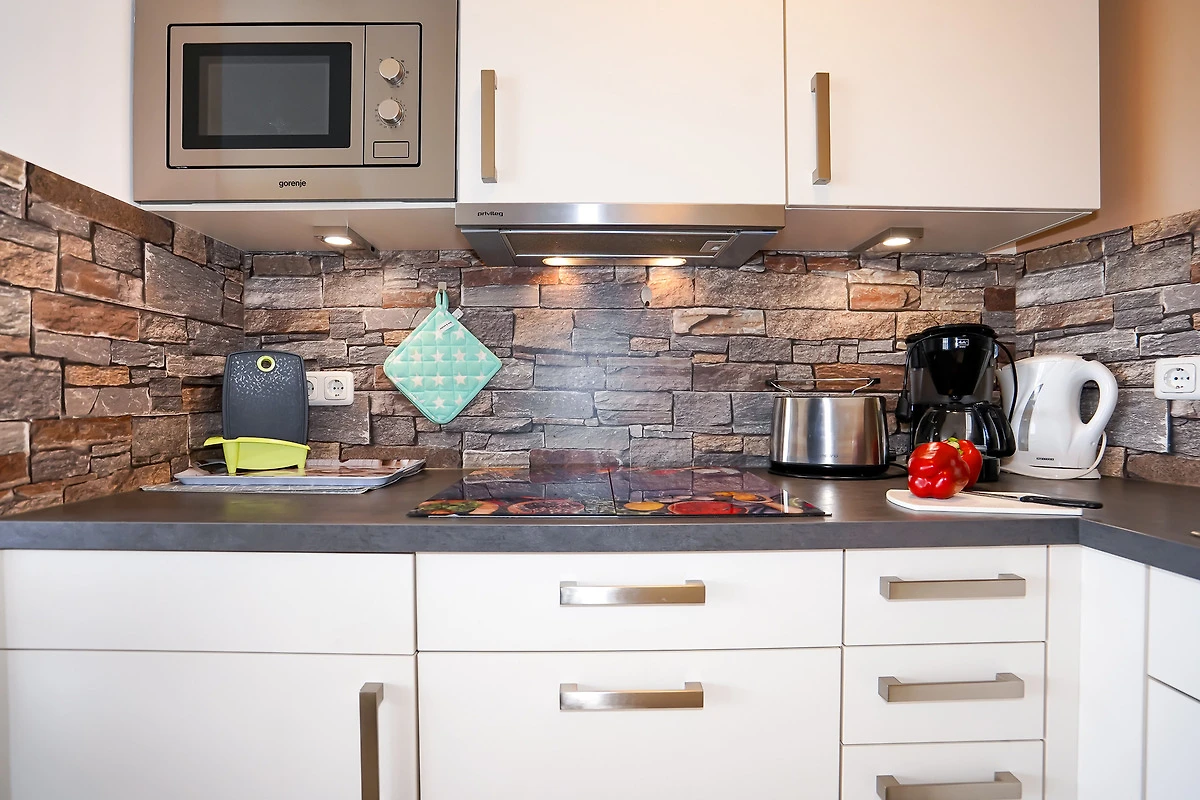 Die offen gestaltete moderne Küche bietet Ihnen ein 4er-Cerankochfeld, Spülmaschine, Kühlschrank mit Gefrierfach, Mikrowelle inklusive Backfunktion und diverse Elektrokleingeräte.