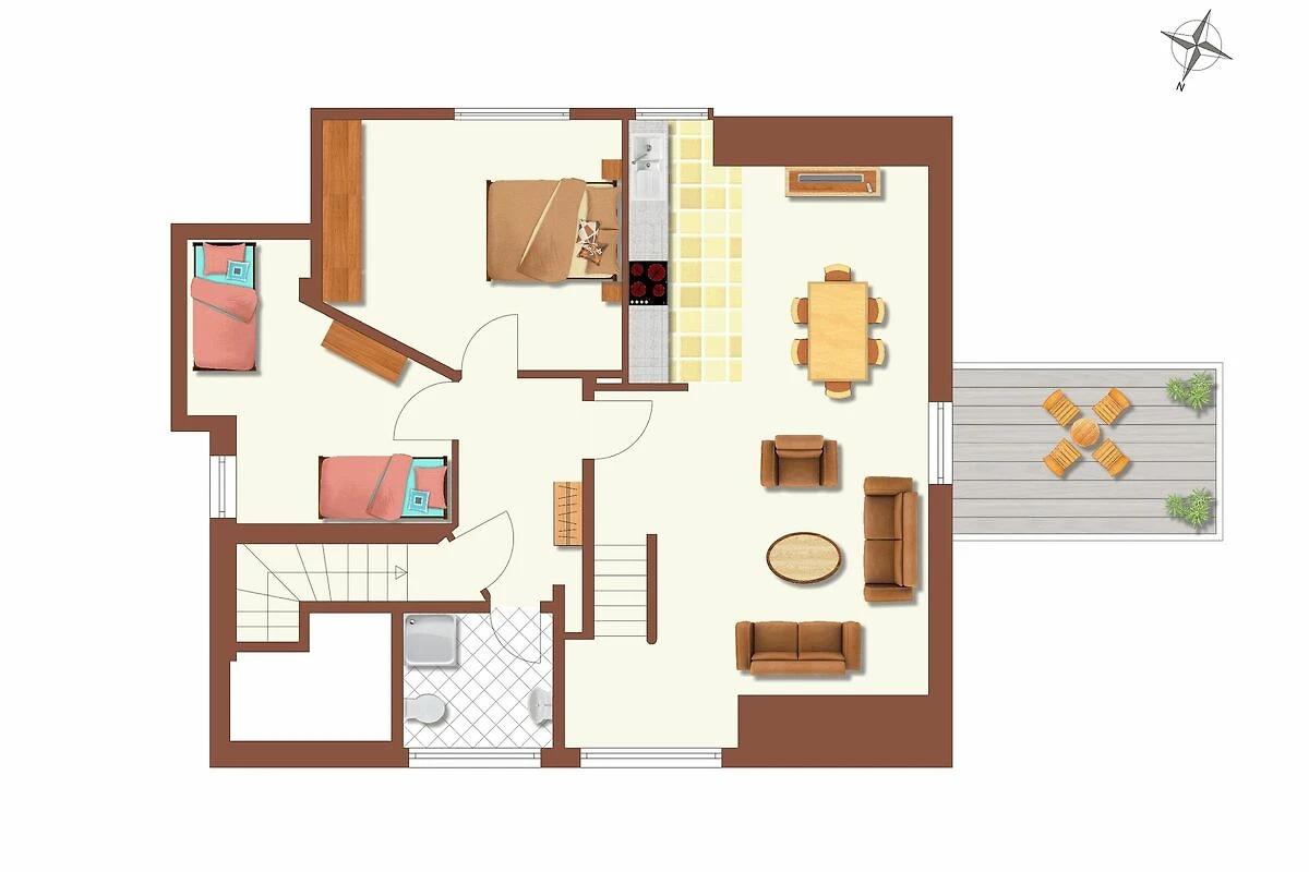 Willkommen in unserer großzügigen Dachgeschosswohnung! Auf ca. 68 qm erwarten Sie moderner Komfort und genügend Platz für bis zu 4 Personen plus Kleinkind. Die neue, vollausgestattete Küchenzeile lädt zum Kochen ein, während das Elternschlafzimmer mit einem komfortablen Ehebett und das zweite Schlafzimmer mit zwei Einzelbetten für erholsamen Schlaf sorgen. Der großzügige Wohn-/Essbereich führt direkt zu einem außergewöhnlich großen, möblierten Balkon mit Süd-West-Ausrichtung, der zum Entspannen einlädt.