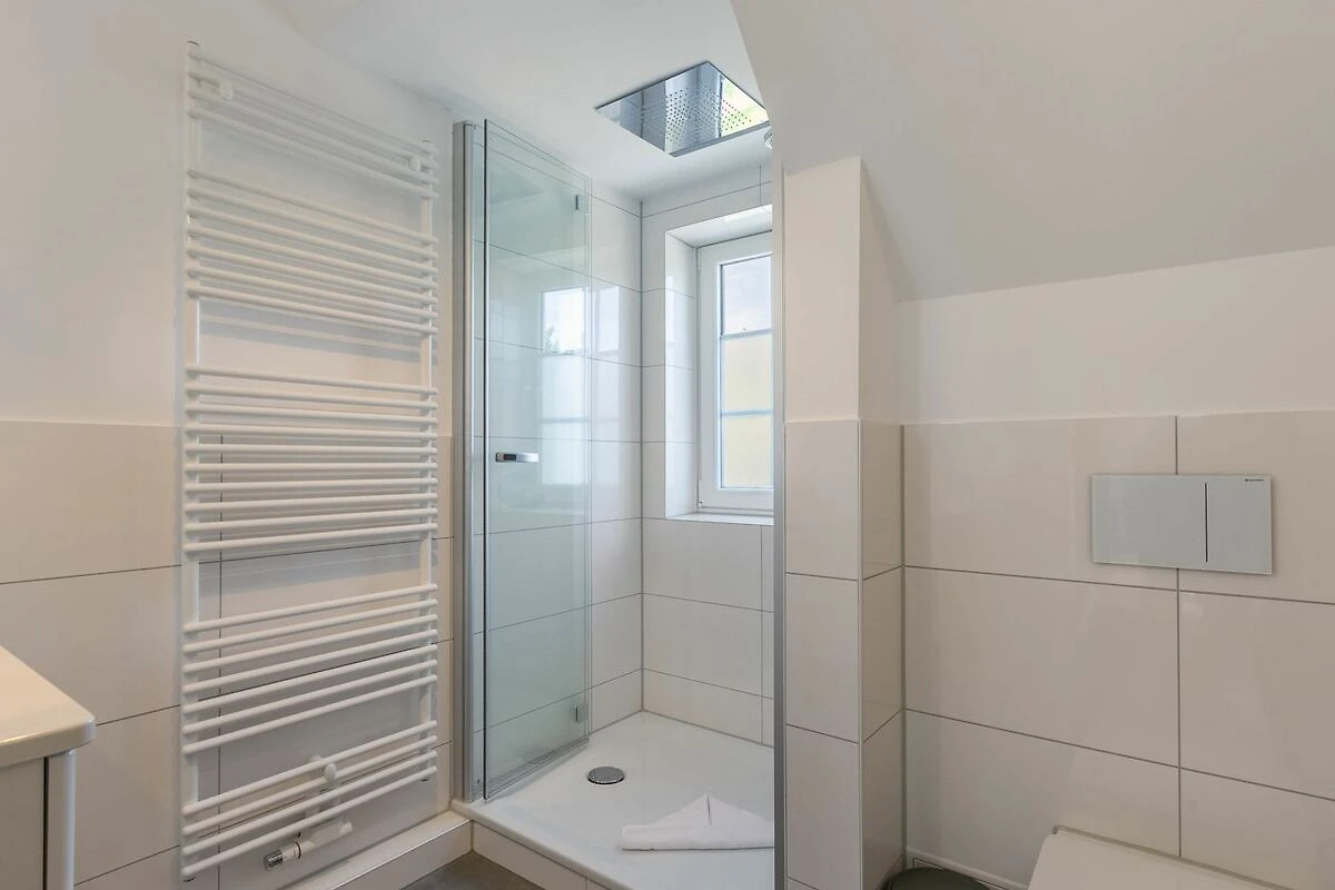 Badezimmer (Duschbad) mit Regendusche, WC, Handtuchwärmer, Tageslicht und Föhn.