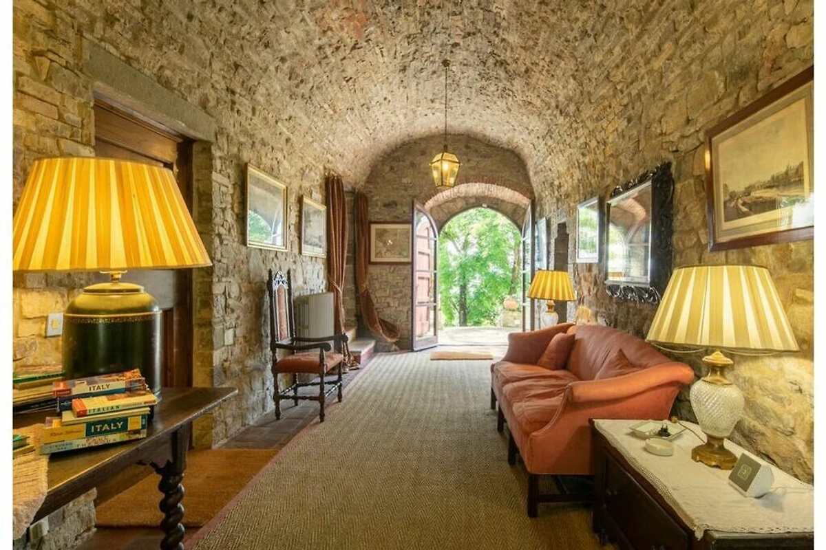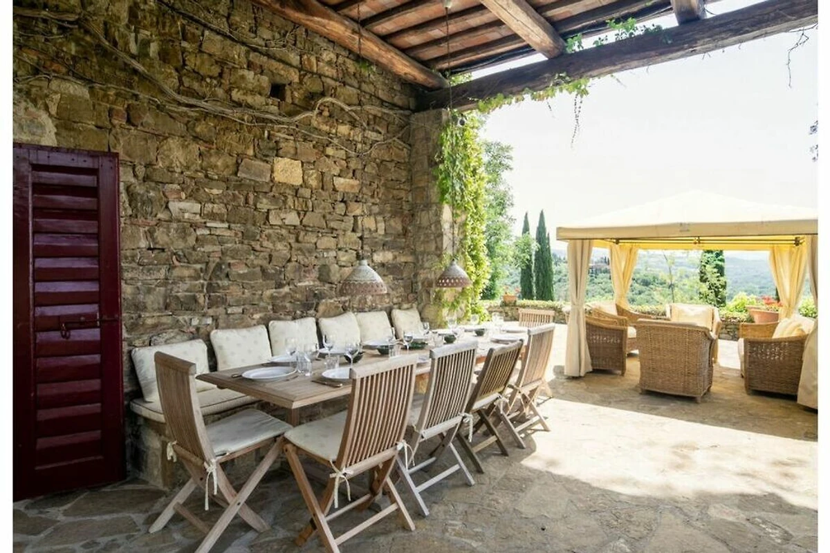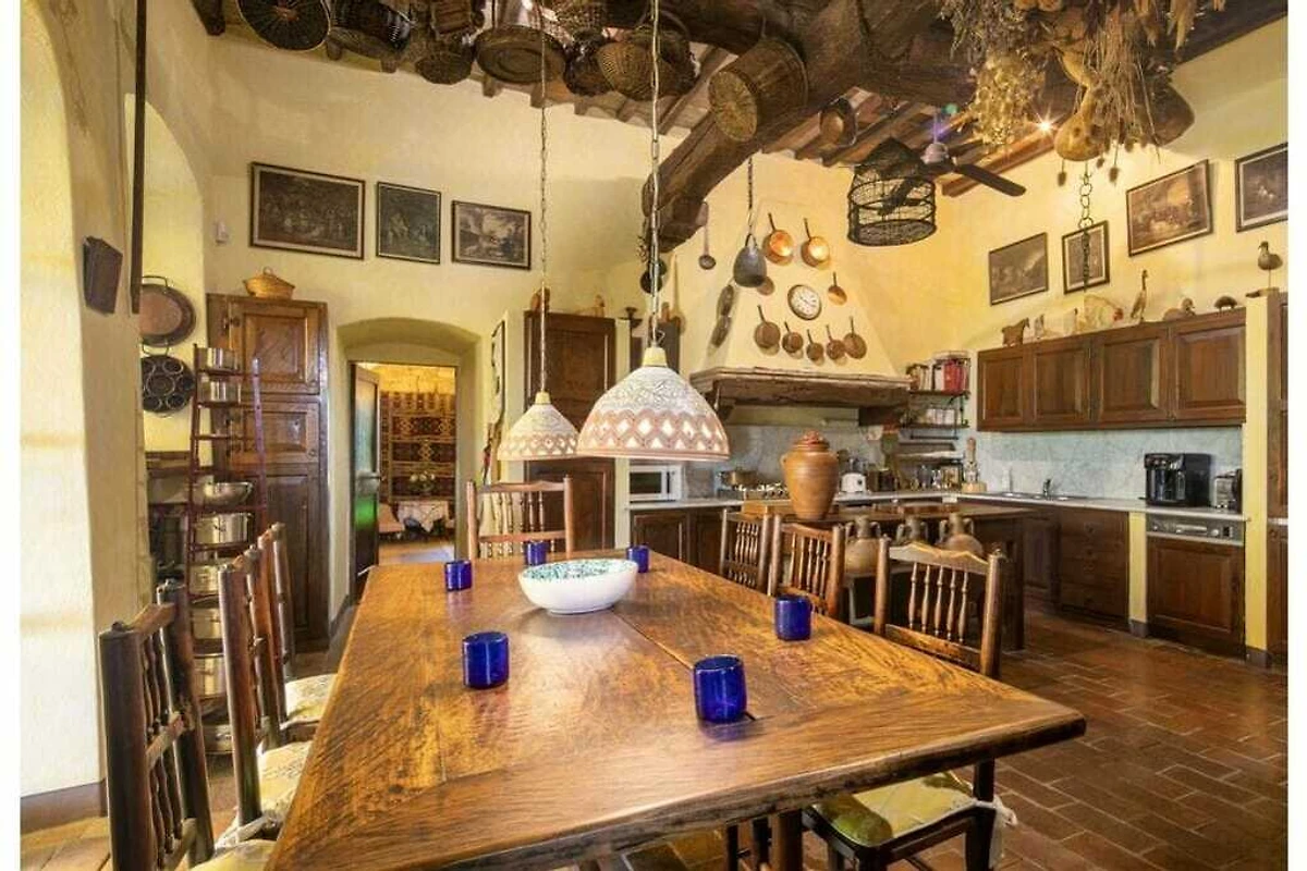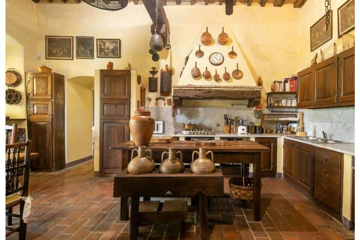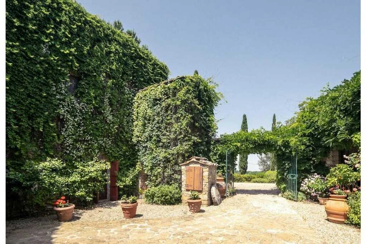 Das von 10 Hektar Olivenhainen, Weinbergen und Gärten umgebene Anwesen stammt aus dem 13. Jahrhundert und verfügt über eine große Veranda mit einem Esstisch, von dem aus Sie einen atemberaubenden Blick auf die toskanische Landschaft genießen können.