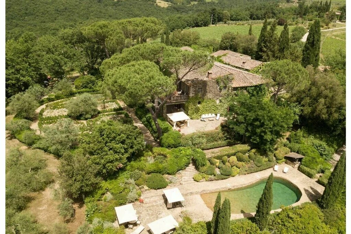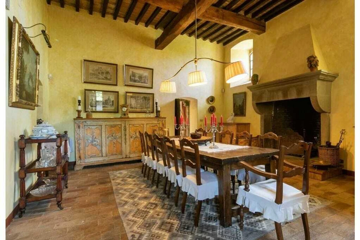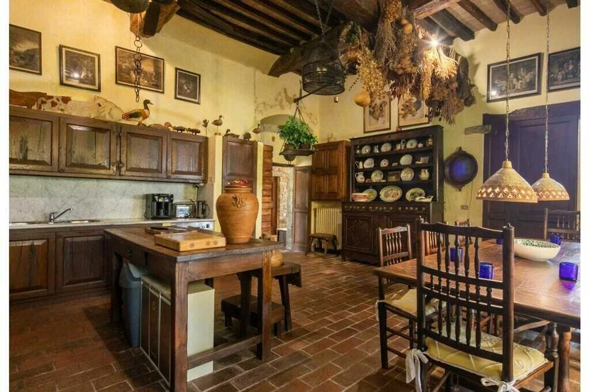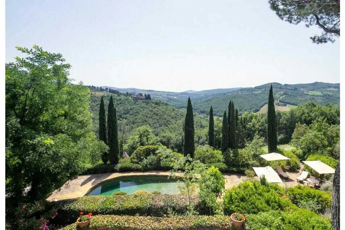 Das von 10 Hektar Olivenhainen, Weinbergen und Gärten umgebene Anwesen stammt aus dem 13. Jahrhundert und verfügt über eine große Veranda mit einem Esstisch, von dem aus Sie einen atemberaubenden Blick auf die toskanische Landschaft genießen können.