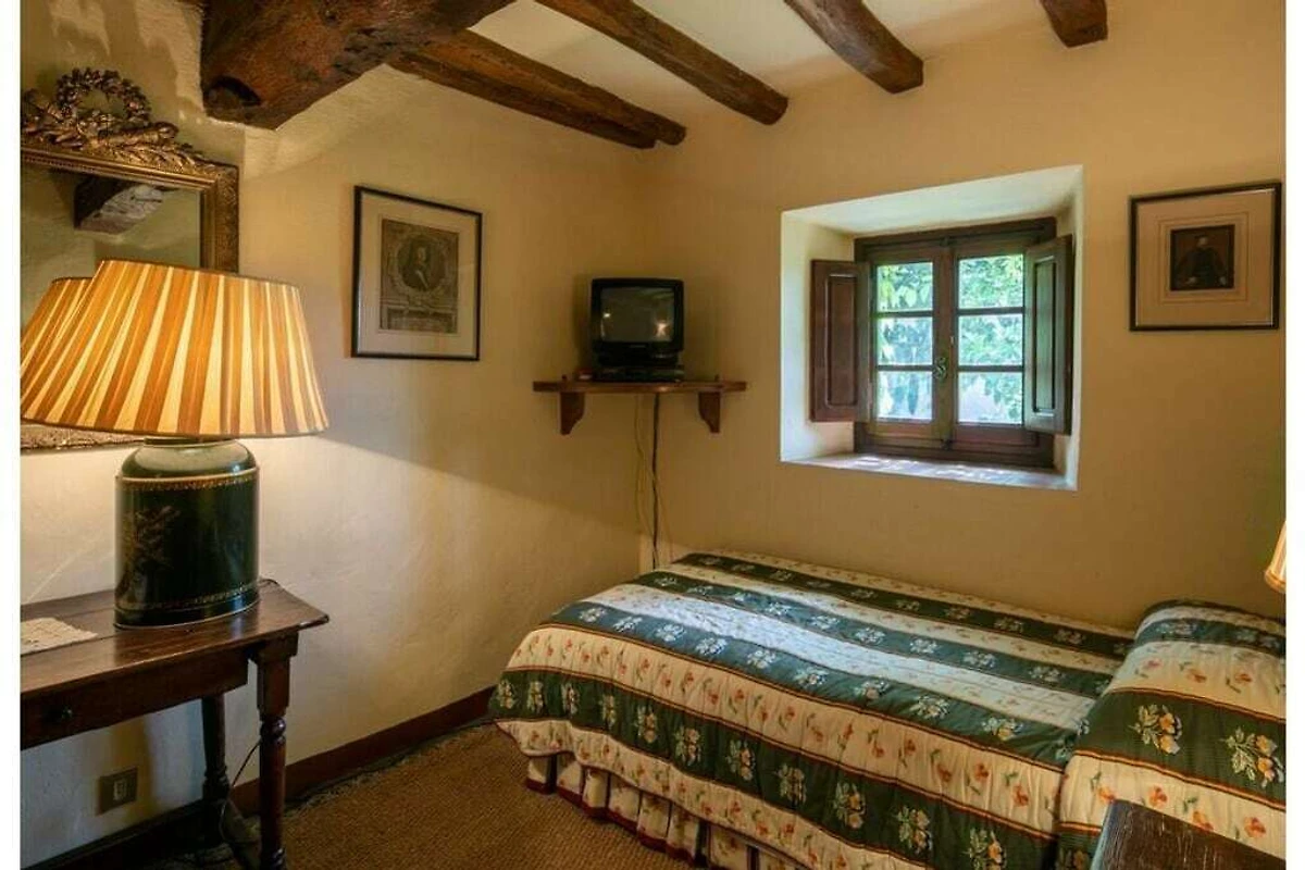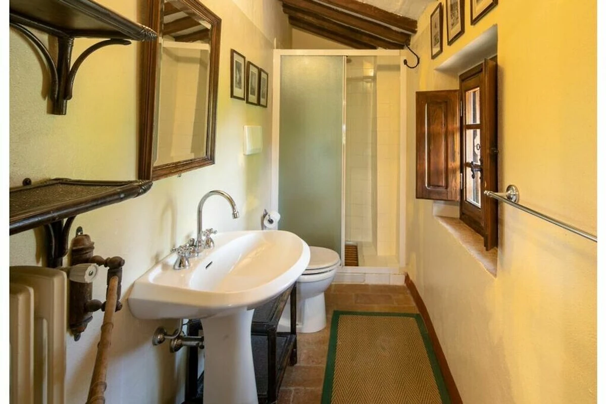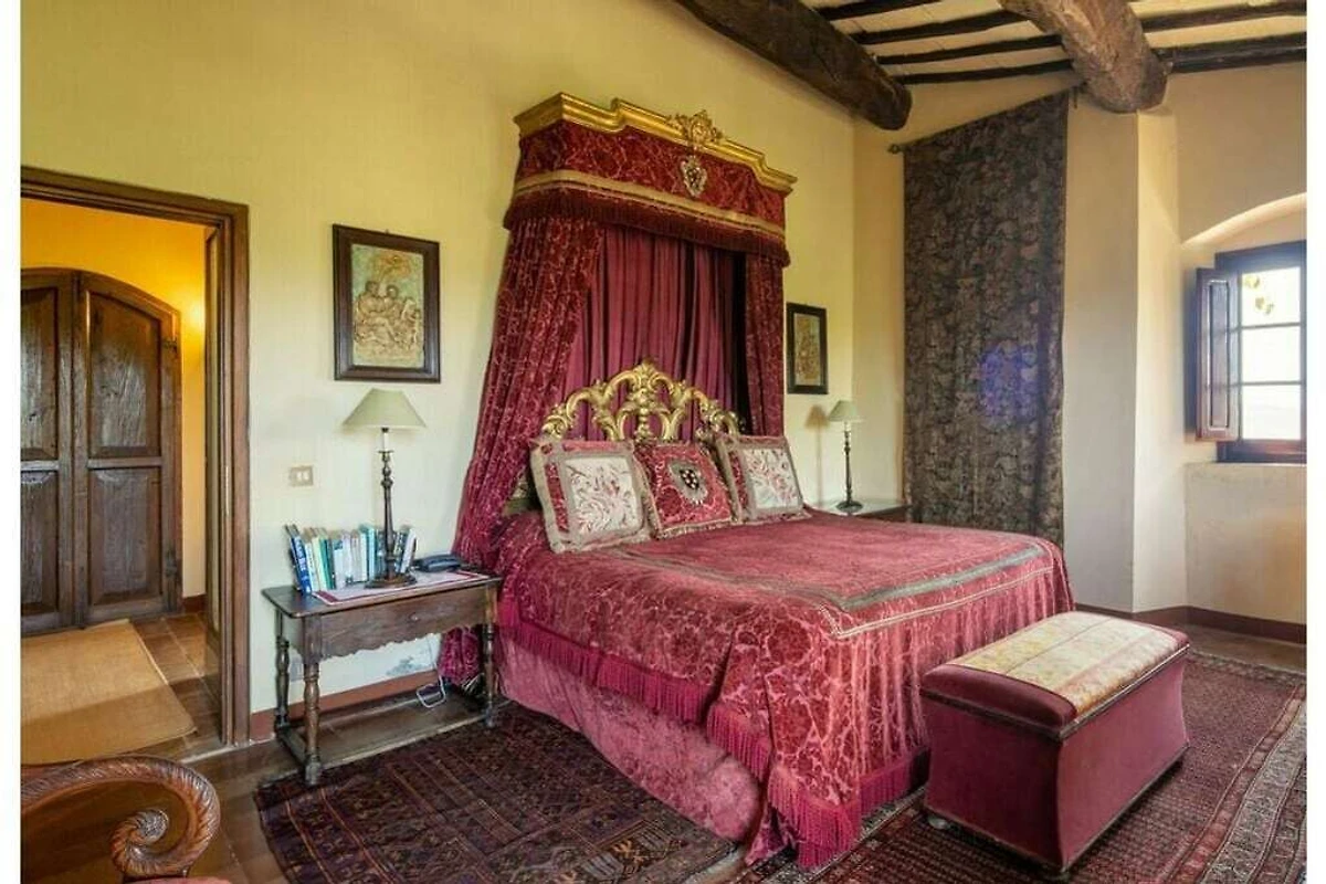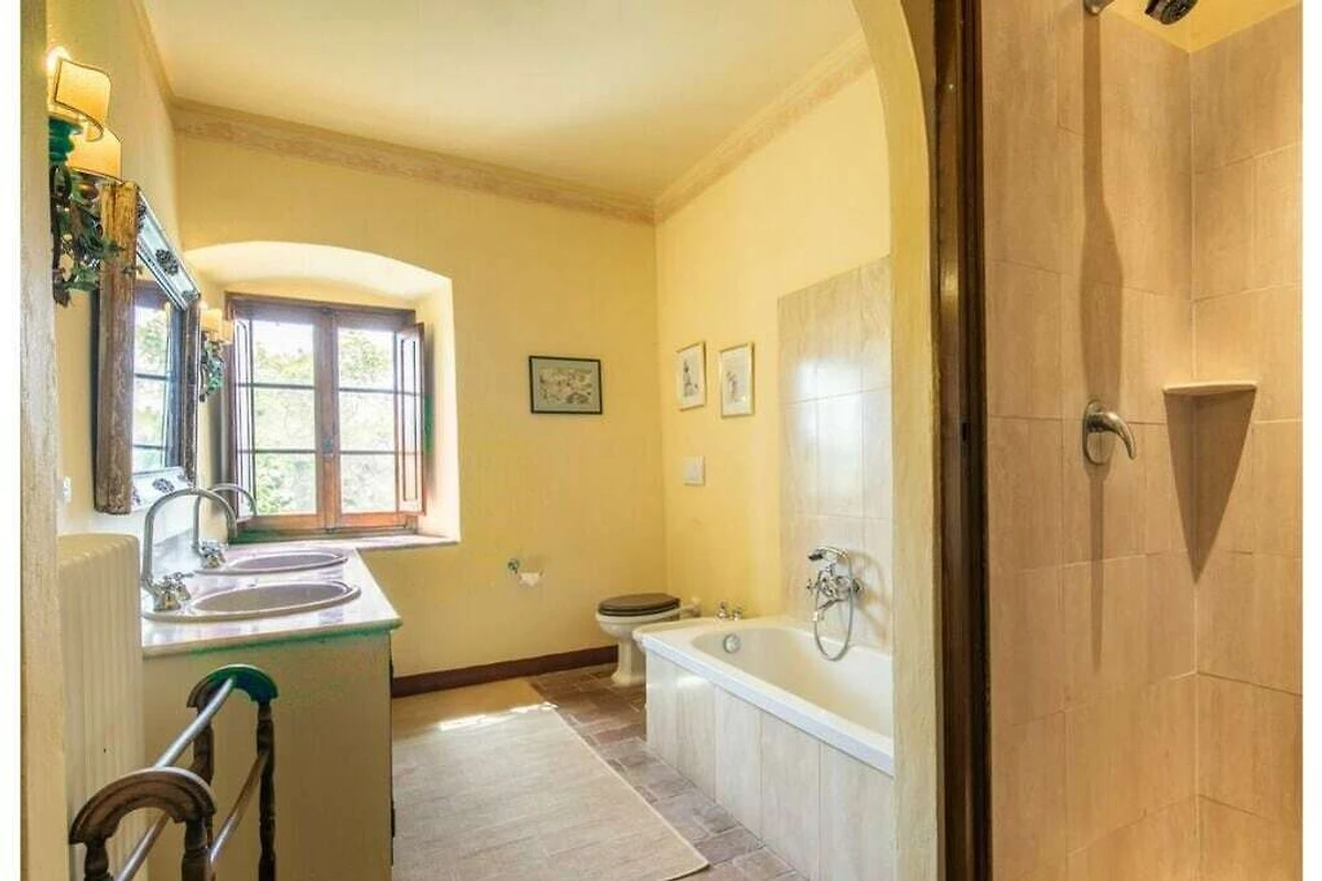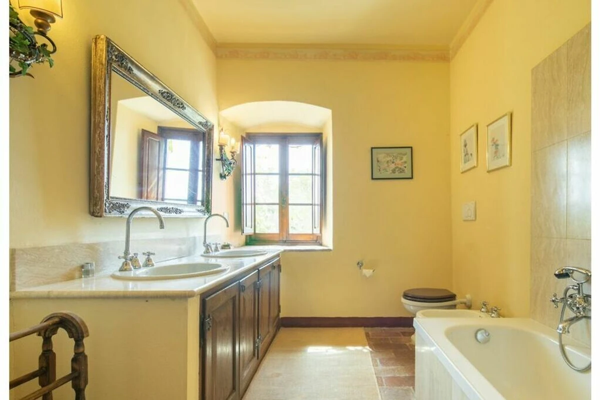 Das von 10 Hektar Olivenhainen, Weinbergen und Gärten umgebene Anwesen stammt aus dem 13. Jahrhundert und verfügt über eine große Veranda mit einem Esstisch, von dem aus Sie einen atemberaubenden Blick auf die toskanische Landschaft genießen können.