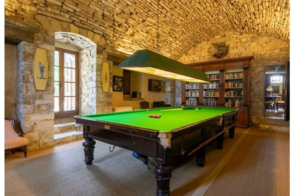 Das Erdgeschoss: Das Erdgeschoss besteht aus: einer voll ausgestatteten Küche (mit Geschirrspüler, Mikrowelle, Backofen, Kühlschrank und Esstisch); einem geräumigen Esszimmer mit Holztisch; einem Wohnzimmer mit Sofa und Fernseher; einem großen Billardzimmer. Eine Toilette bildet den Rest der Etage.
