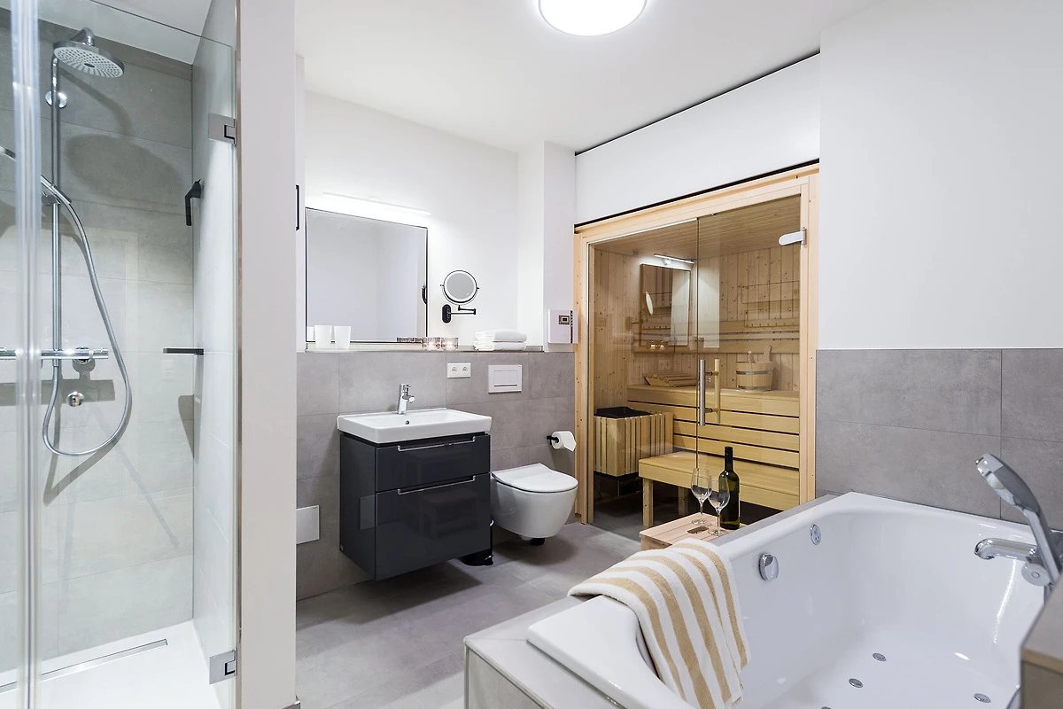 Sie ist für bis zu 4 Personen buchbar (2 Schlafzimmer mit Doppelbetten 180 x 200 cm) (der angegebene Preis bezieht sich immer auf 2 Erwachsene und 2 Kinder, extra Personen können ggf. auf Anfrage dazu gebucht werden) und verfügt über eine gehobene 5-Sterne-Ausstattung: 2 Badezimmer, 1 Sauna, 1 Whirlwanne sowie 1 Terrasse. Die Küche ist komplett ausgestattet und bietet einen grossen Esstisch für bis zu 6 Personen. Zudem gibt es einen Geschirrspüler, einen Kühlschrank inkl. Gefrierfach, eine Mikrowelle sowie einen Waschtrockner. Im Wohnbereich erwartet Sie ein 50-Zoll-Smart-TV sowie der Zugang zur grosszügigen Terrasse. Die Terrasse ist ebenfalls mit einem Esstisch ausgestattet. Selbstverständlich bieten wir schnelles und kostenfreies WLAN sowie einen PKW-Stellplatz direkt am Haus.
