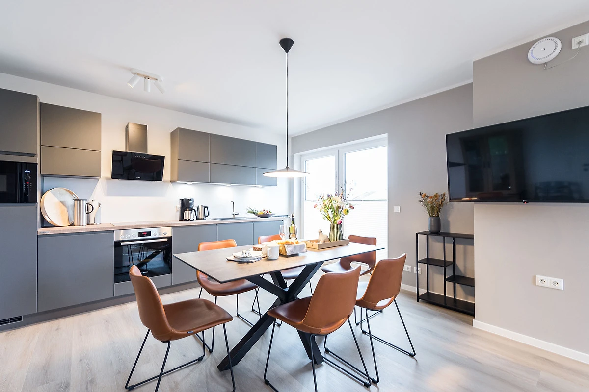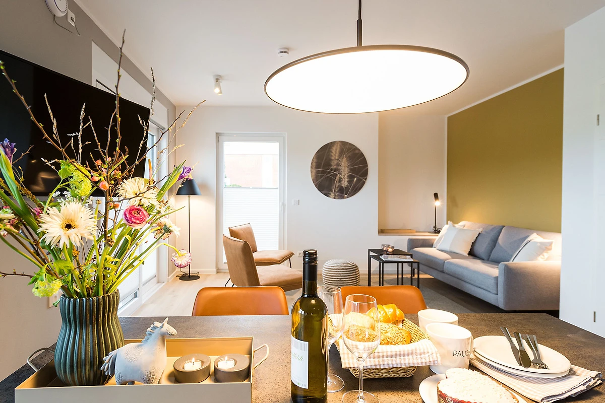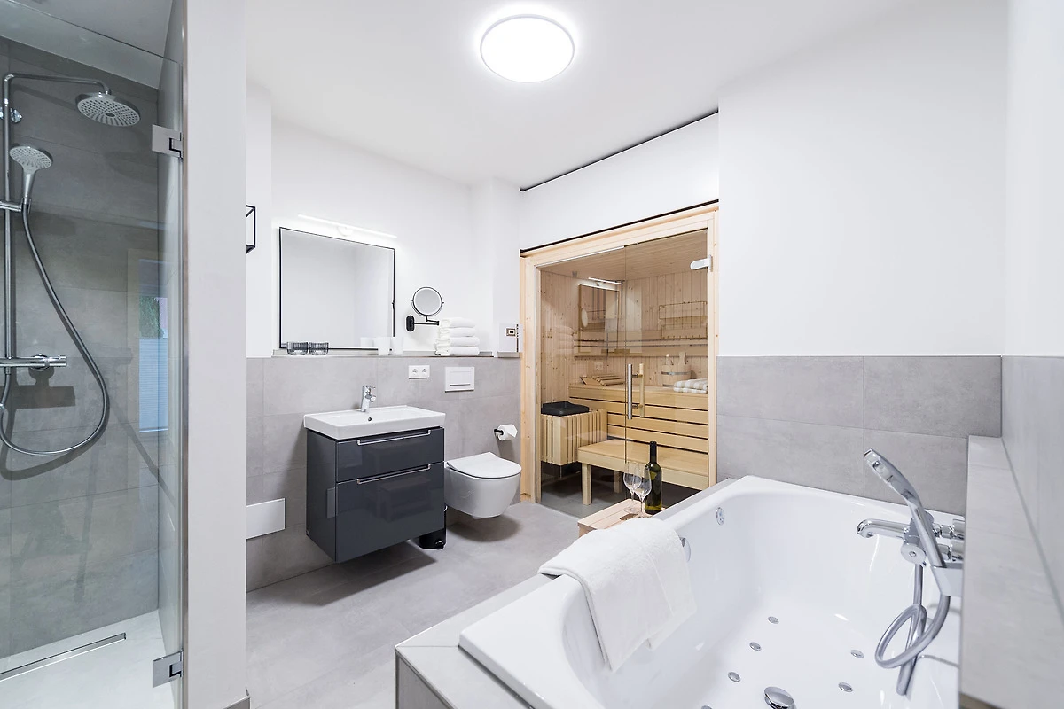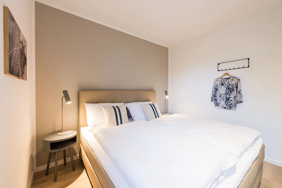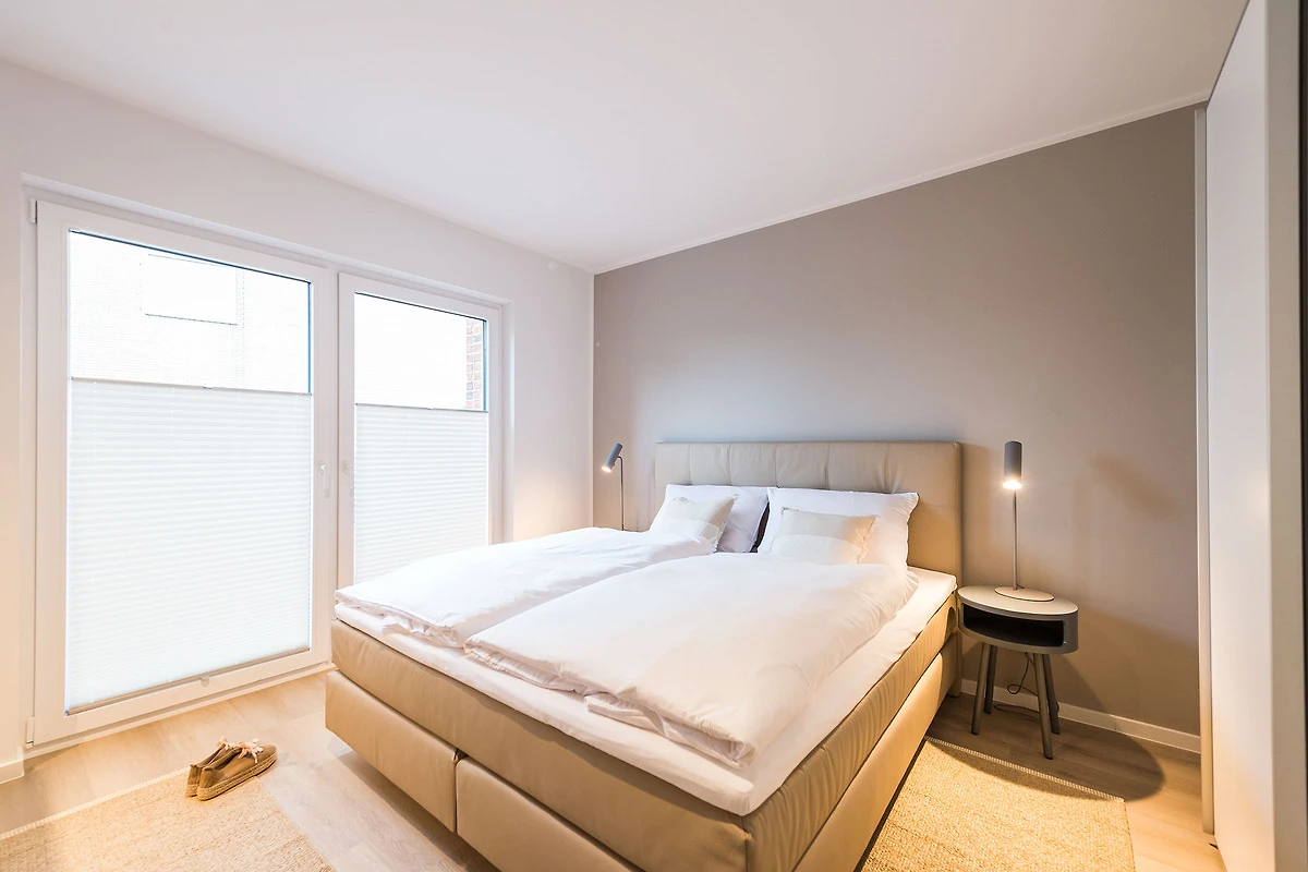 Sie ist für bis zu 4 Personen buchbar (2 Schlafzimmer mit Doppelbetten 180 x 200 cm) (der angegebene Preis bezieht sich immer auf 2 Erwachsene und 2 Kinder, extra Personen können ggf. auf Anfrage dazu gebucht werden) und verfügt über eine gehobene 5-Sterne-Ausstattung: 2 Badezimmer, 1 Sauna, 1 Whirlwanne sowie 1 Terrasse. Die Küche ist komplett ausgestattet und bietet einen grossen Esstisch für bis zu 6 Personen. Zudem gibt es einen Geschirrspüler, einen Kühlschrank inkl. Gefrierfach, eine Mikrowelle sowie einen Waschtrockner. Im Wohnbereich erwartet Sie ein 50-Zoll-Smart-TV sowie der Zugang zur grosszügigen Terrasse. Die Terrasse ist ebenfalls mit einem Esstisch ausgestattet. Selbstverständlich bieten wir schnelles und kostenfreies WLAN sowie einen PKW-Stellplatz direkt am Haus.