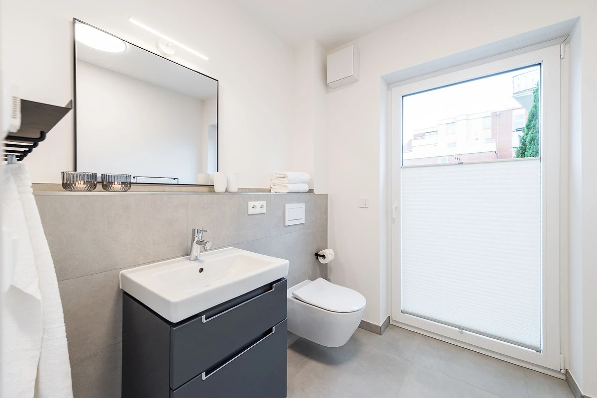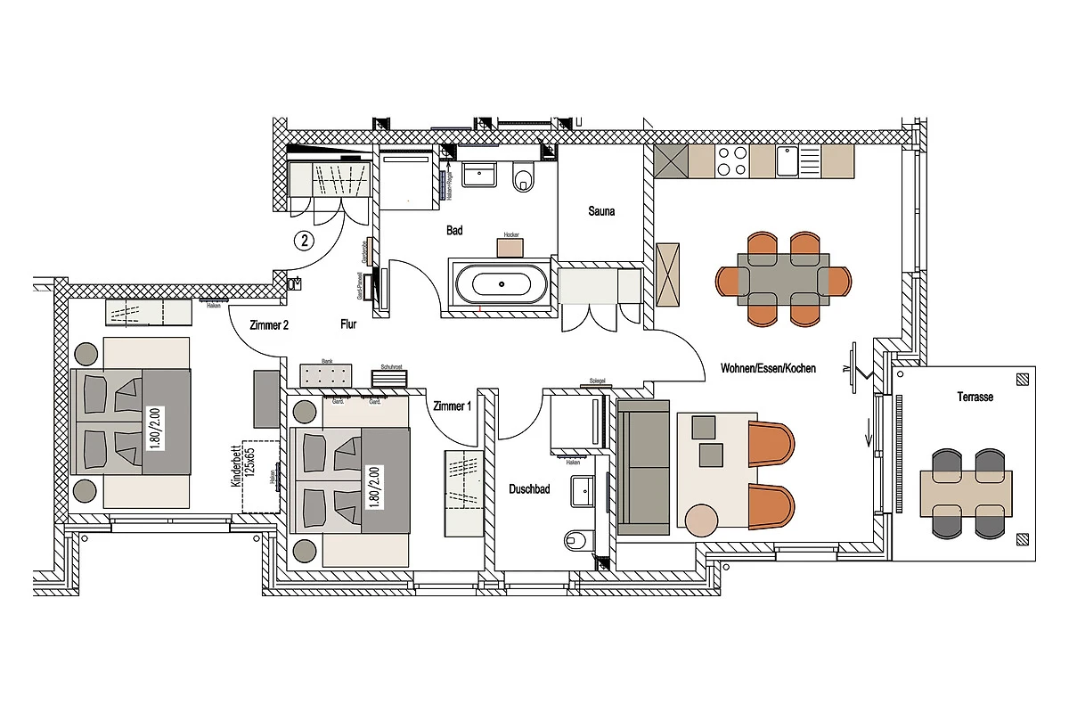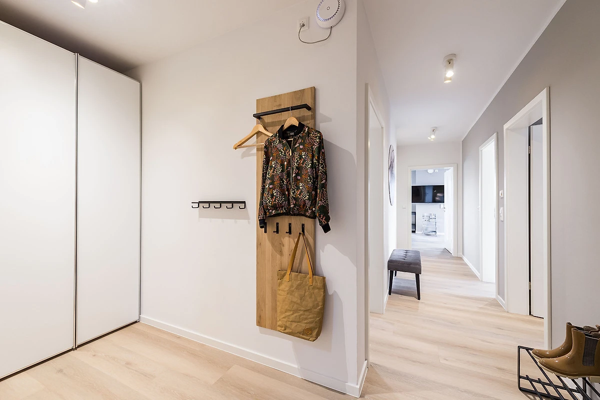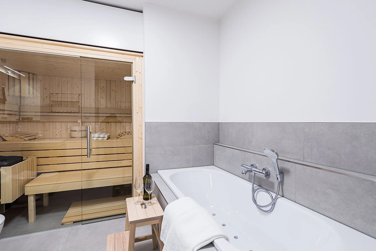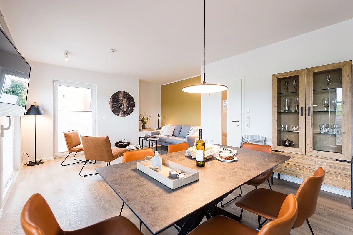 Sie ist für bis zu 4 Personen buchbar (2 Schlafzimmer mit Doppelbetten 180 x 200 cm) (der angegebene Preis bezieht sich immer auf 2 Erwachsene und 2 Kinder, extra Personen können ggf. auf Anfrage dazu gebucht werden) und verfügt über eine gehobene 5-Sterne-Ausstattung: 2 Badezimmer, 1 Sauna, 1 Whirlwanne sowie 1 Terrasse. Die Küche ist komplett ausgestattet und bietet einen grossen Esstisch für bis zu 6 Personen. Zudem gibt es einen Geschirrspüler, einen Kühlschrank inkl. Gefrierfach, eine Mikrowelle sowie einen Waschtrockner. Im Wohnbereich erwartet Sie ein 50-Zoll-Smart-TV sowie der Zugang zur grosszügigen Terrasse. Die Terrasse ist ebenfalls mit einem Esstisch ausgestattet. Selbstverständlich bieten wir schnelles und kostenfreies WLAN sowie einen PKW-Stellplatz direkt am Haus.