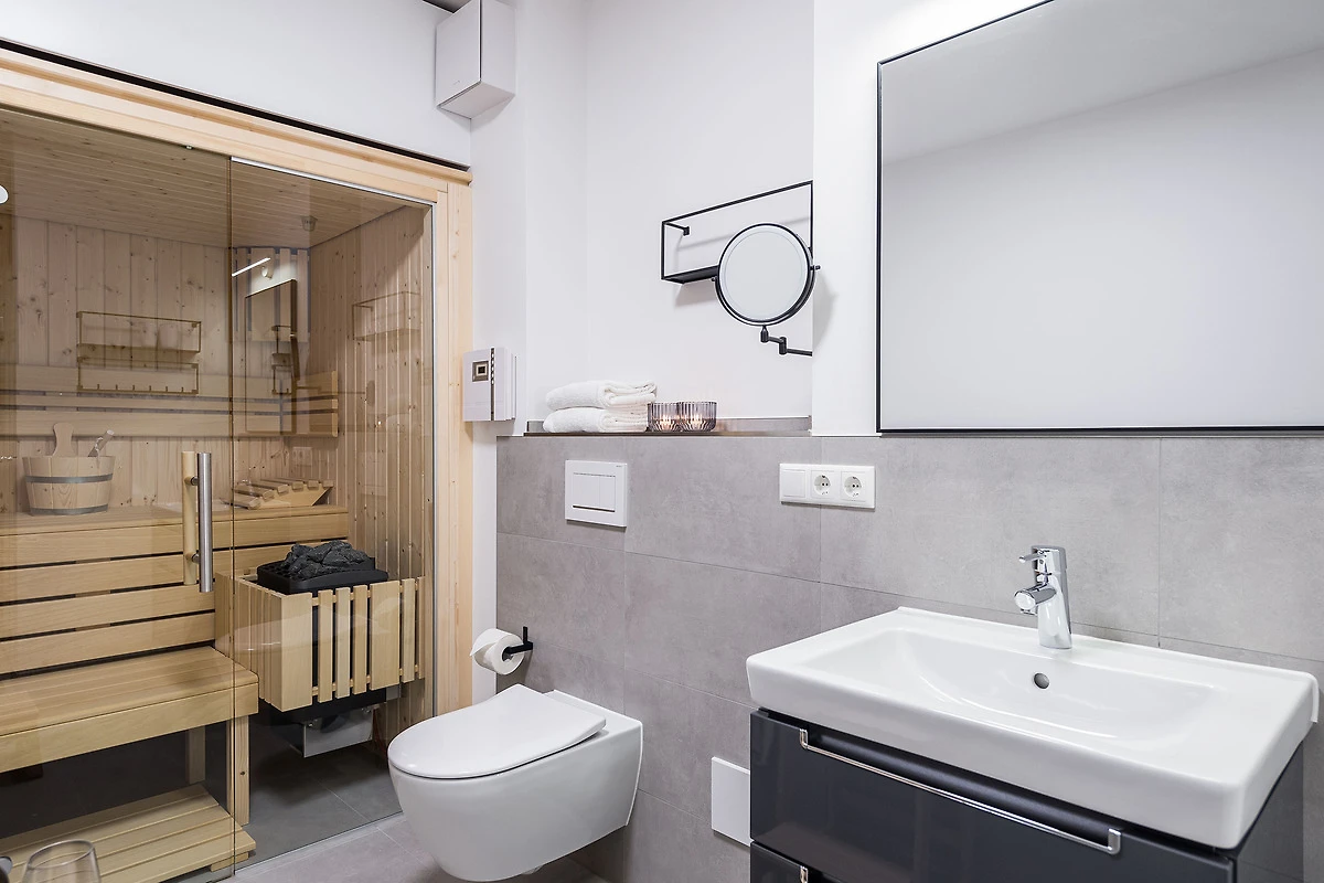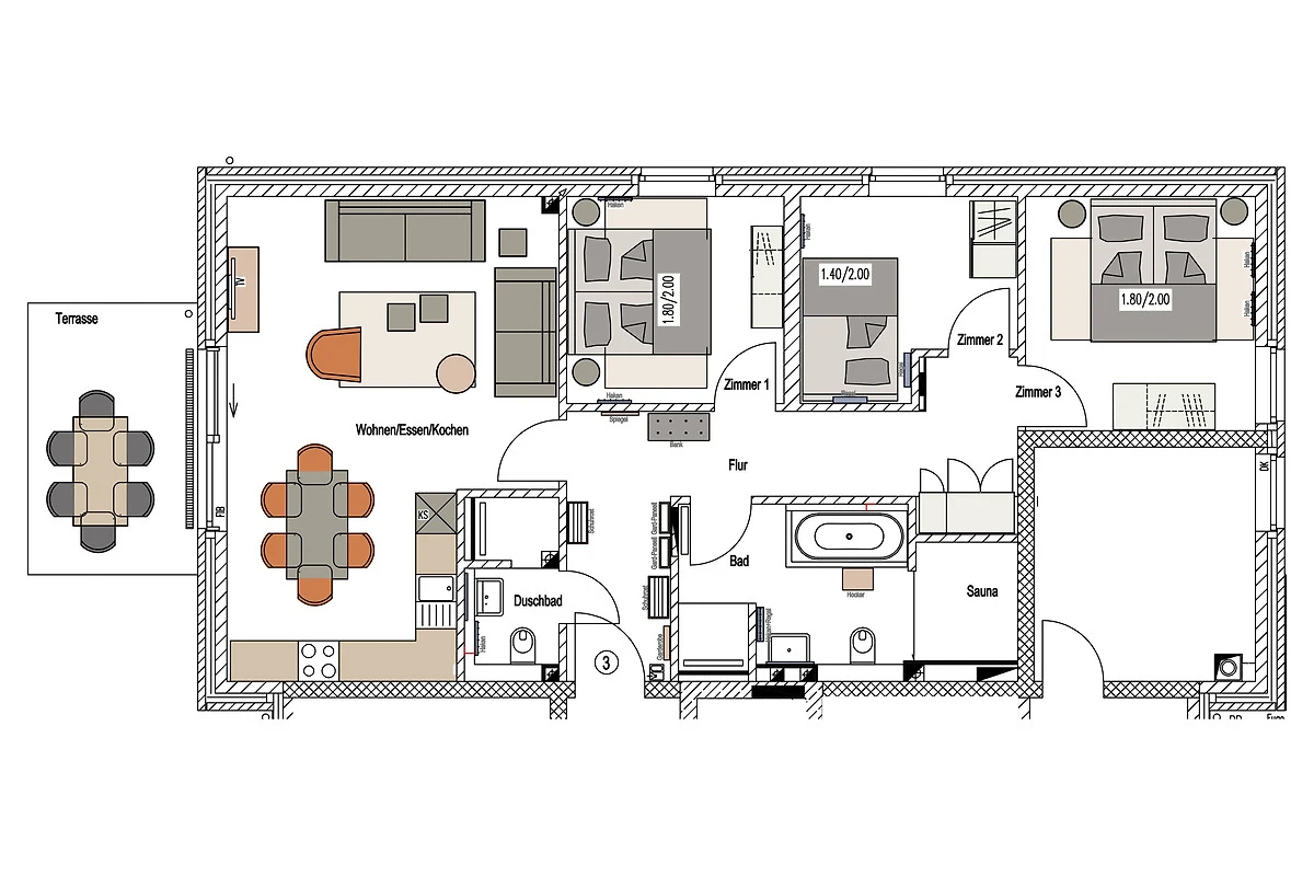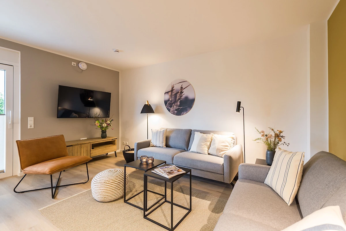 Sie ist für bis zu 6 Personen buchbar (2 Schlafzimmer mit Doppelbetten 180 x 200 cm, 1 Schlafzimmer mit Doppelbett 140 x 200 cm) (der angegebene Preis bezieht sich immer auf 2 Erwachsene und 2 Kinder, extra Personen können ggf. auf Anfrage dazu gebucht werden) und verfügt über eine gehobene 5-Sterne-Ausstattung: 2 Badezimmer, 1 Sauna, 1 Whirlwanne sowie 1 Terrasse. Die Küche ist komplett ausgestattet und bietet einen grossen Esstisch für bis zu 6 Personen. Zudem gibt es einen Geschirrspüler, einen Kühlschrank inkl. Gefrierfach, eine Mikrowelle sowie einen Waschtrockner. Im Wohnbereich erwartet Sie ein 55-Zoll-Smart-TV sowie der Zugang zur grosszügigen Terrasse. Die Terrasse ist ebenfalls mit einem grossen Esstisch ausgestattet. Selbstverständlich bieten wir schnelles und kostenfreies WLAN sowie einen PKW-Stellplatz direkt am Haus. Auf den hauseigenen Parkplätzen stehen Ihnen E-Auto-Ladegeräte (Wallboxen) zur Verfügung (gegen Gebühr).Aufgrund der Allergiker gerechten Ausstattung sind Haustiere nicht erlaubt.