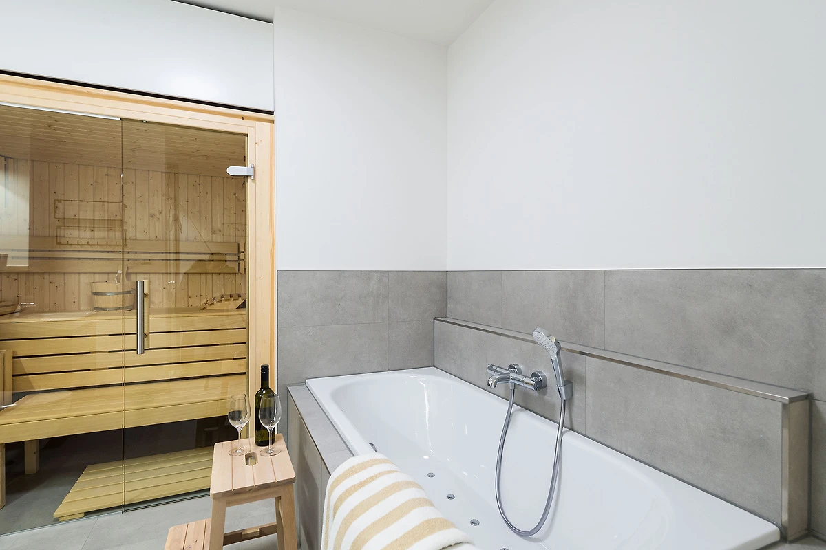 Sie ist für bis zu 4 Personen buchbar (2 Schlafzimmer mit Doppelbetten 180 x 200 cm) (der angegebene Preis bezieht sich immer auf 2 Erwachsene und 2 Kinder, extra Personen können ggf. auf Anfrage dazu gebucht werden) und verfügt über eine gehobene 5-Sterne-Ausstattung: 2 Badezimmer, 1 Sauna, 1 Whirlwanne sowie 1 Balkon (frontaler Meerblick). Die Küche ist komplett ausgestattet und bietet einen grossen Esstisch für bis zu 6 Personen. Zudem gibt es einen Geschirrspüler, einen