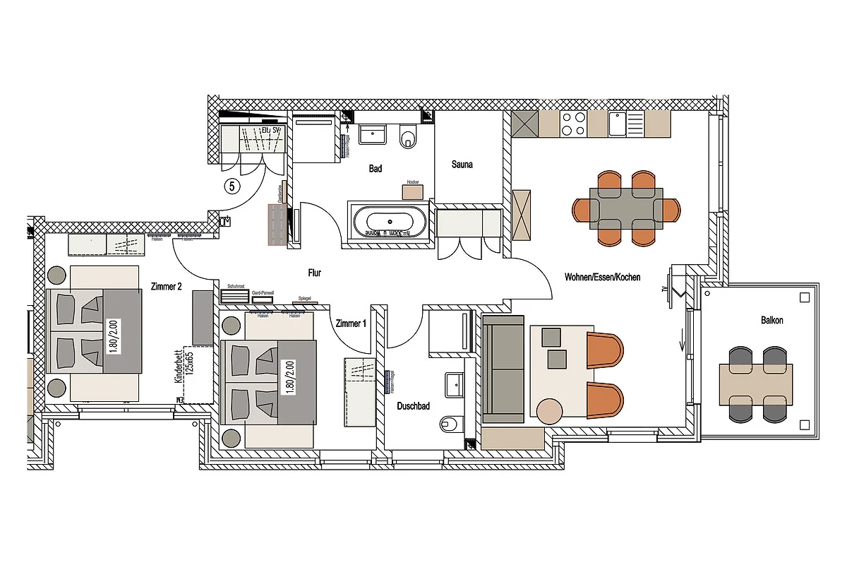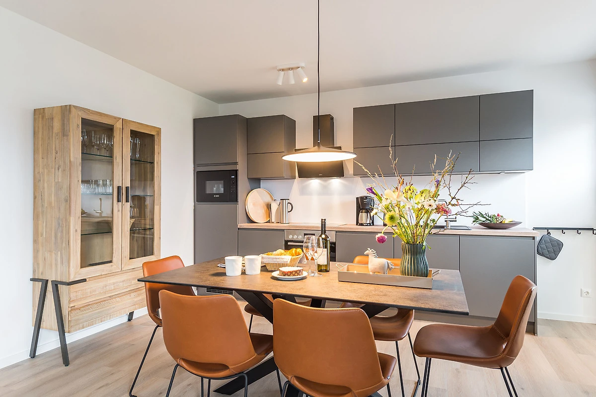Sie ist für bis zu 4 Personen buchbar (2 Schlafzimmer mit Doppelbetten 180 x 200 cm) (der angegebene Preis bezieht sich immer auf 2 Erwachsene und 2 Kinder, extra Personen können ggf. auf Anfrage dazu gebucht werden) und verfügt über eine gehobene 5-Sterne-Ausstattung: 2 Badezimmer, 1 Sauna, 1 Whirlwanne sowie 1 Balkon (frontaler Meerblick). Die Küche ist komplett ausgestattet und bietet einen grossen Esstisch für bis zu 6 Personen. Zudem gibt es einen Geschirrspüler, einen Kühlschrank inkl. Gefrierfach, eine Mikrowelle sowie einen Waschtrockner. Im Wohnbereich erwartet Sie ein 50-Zoll-Smart-TV sowie der Zugang zum Balkon. Der Balkon ist ebenfalls mit einem Esstisch ausgestattet und bietet einen herrlichen, frontalen Blick auf die Ostsee. Selbstverständlich bieten wir schnelles und kostenfreies WLAN sowie einen PKW-Stellplatz direkt am Haus. Auf den hauseigenen Parkplätzen stehen Ihnen E-Auto-Ladegeräte (Wallboxen) zur Verfügung (gegen Gebühr). Aufgrund der Allergiker gerechten Ausstattung sind Haustiere nicht erlaubt.