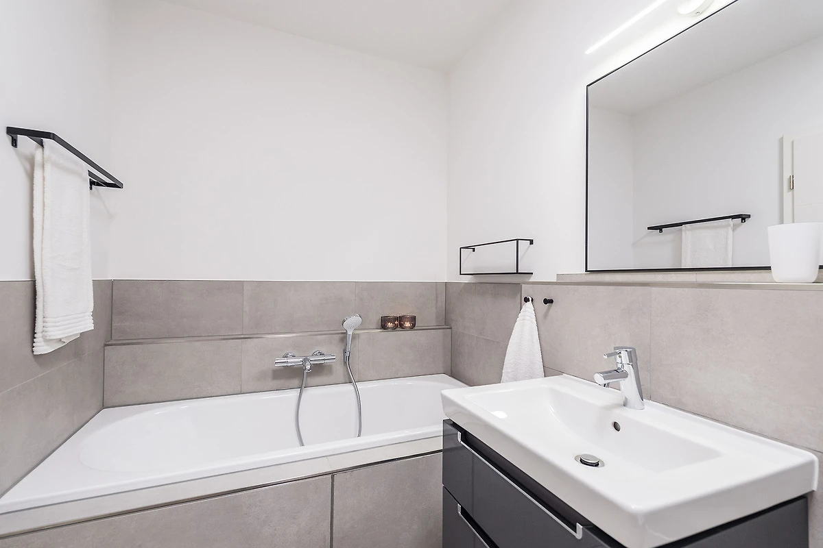 Sie ist für bis zu 2 Personen buchbar (1 Schlafzimmer mit Doppelbett 180 x 200 cm) und verfügt über eine gehobene 5-Sterne-Ausstattung: 2 Badezimmer, 1 Sauna, 1 Whirlwanne sowie 1 Balkon (seitlicher Meerblick). Die Küche ist komplett ausgestattet und bietet einen Esstisch für bis zu 4 Personen. Zudem gibt es einen Geschirrspüler, einen Kühlschrank