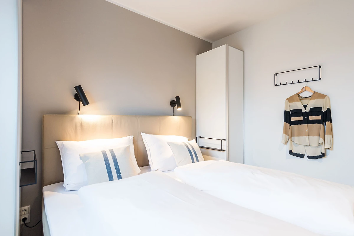 inkl. Gefrierfach, eine Mikrowelle sowie einen Waschtrockner. Im Wohnbereich erwartet Sie ein 55-Zoll-Smart-TV sowie der Zugang zum Balkon. Der Balkon ist ebenfalls mit einem Esstisch ausgestattet und bietet einen herrlichen Blick auf die Ostsee. Selbstverständlich bieten wir schnelles und kostenfreies WLAN sowie einen PKW-Stellplatz direkt am Haus. Auf den hauseigenen Parkplätzen stehen Ihnen E-Auto-Ladegeräte (Wallboxen) zur Verfügung (gegen Gebühr). Aufgrund der Allergiker gerechten Ausstattung sind Haustiere nicht erlaubt.