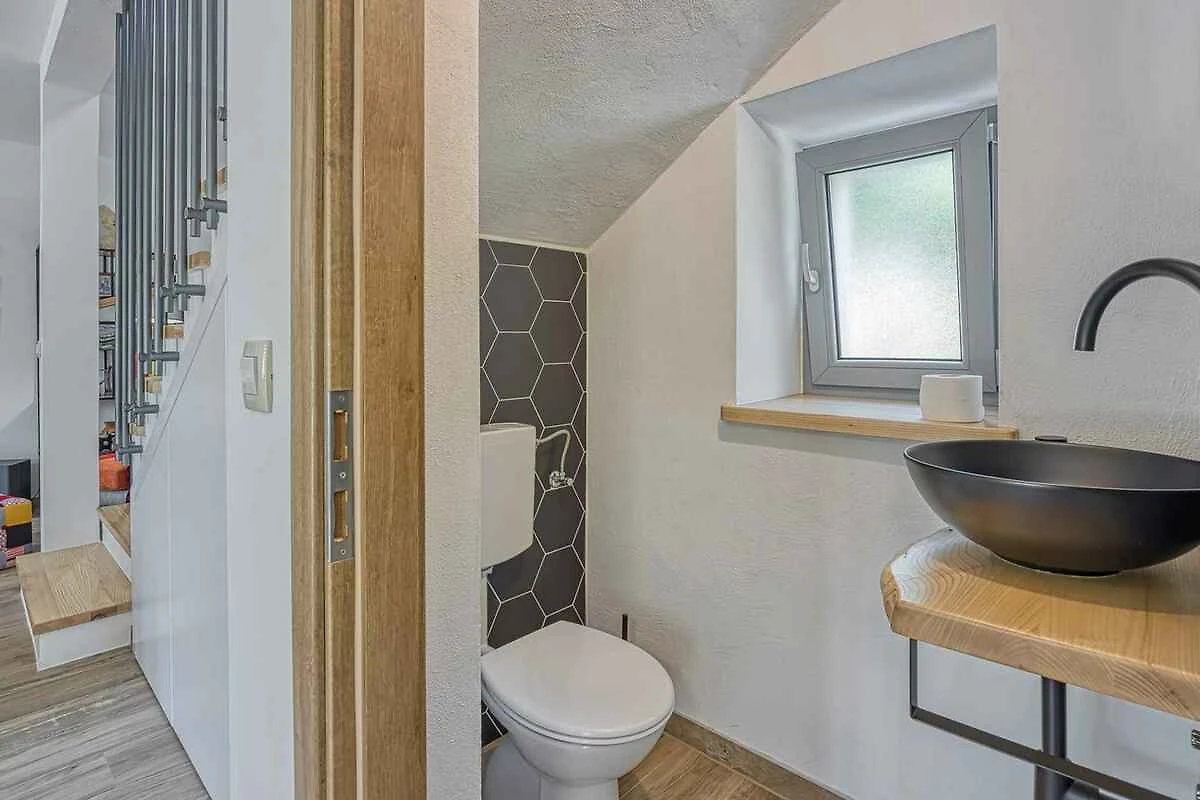 Erdgeschoss: Wohnzimmer mit Sitzecke, TV, Klimaanlage, Kamin und Zugang zur Terrasse (Gartenmöbel). Küche mit Essecke (6 Plätze), Elektroherd, Backofen, Dunstabzugshaube, Geschirrspüler, Kühlschrank (Eisfach), Mikrowelle, Kaffeemaschine, Kapselmaschine, Toaster, elektrischem Wasserkocher und Zugang zur Terrasse. Separates WC mit 1 Waschbecken, WC und Fenster.