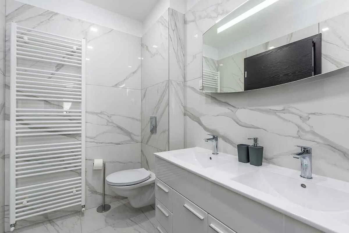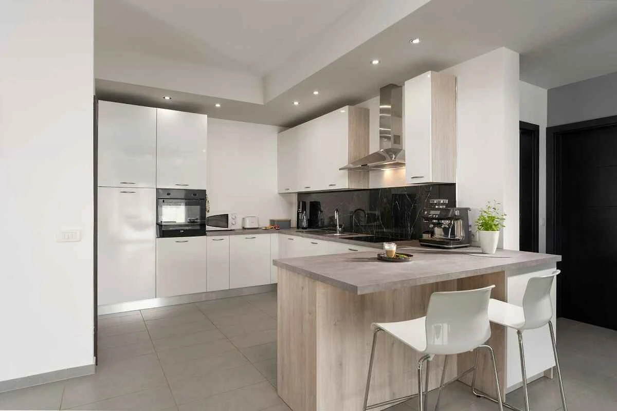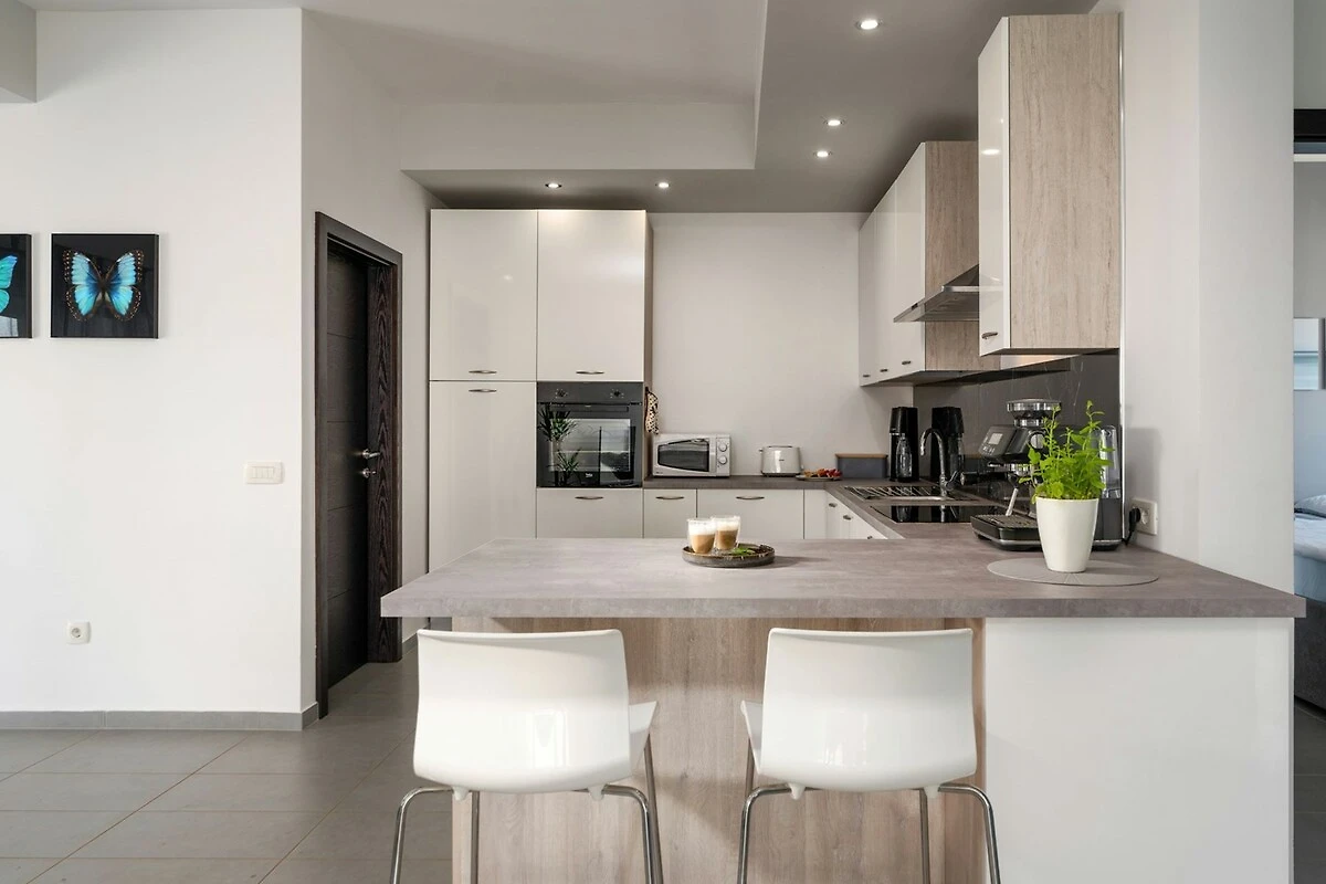 Wohnzimmer mit Sitzecke, TV und Zugang zum Balkon. 3 Schlafzimmer jeweils mit 1 Doppelbett und TV. Schlafzimmer mit 1 Doppelbett, TV und Zugang zum Balkon. Küche mit Essecke (10 Plätze), Backofen, Dunstabzugshaube, Geschirrspüler, Kühlschrank (Eisfach), Mikrowelle, Kaffeemaschine, Toaster und elektrischem Wasserkocher. Bad mit Dusche, Föhn und Fenster. 2 Bäder jeweils mit Dusche, WC, Föhn und Fenster.