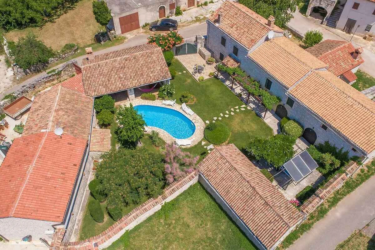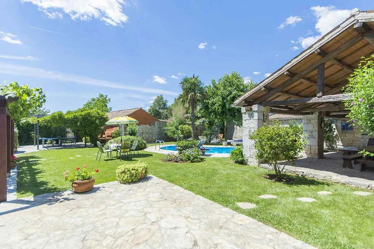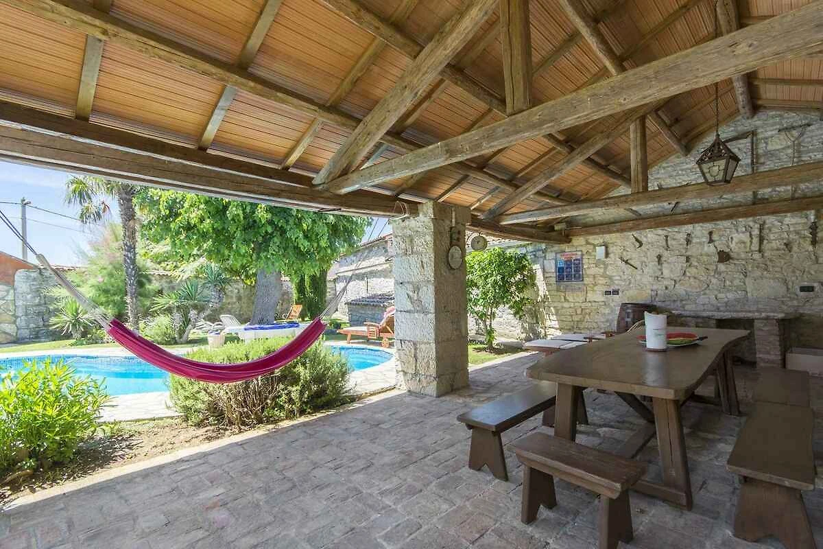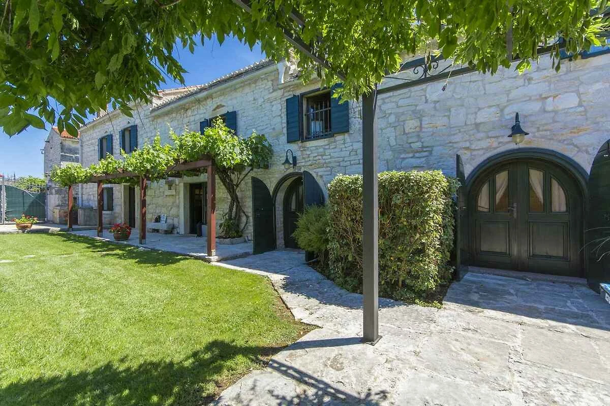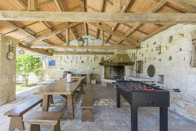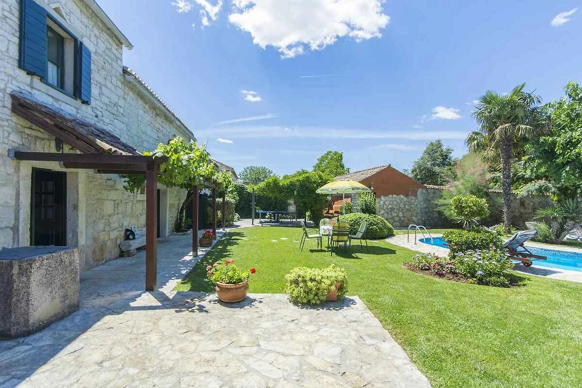Kanfanar. Die Villa befindet sich auf einem Gartengrundstück mit Wiese, Sträuchern und Bäumen. Das Haus verfügt über ein komplett geschlossenes Grundstück von 470 qm, auf dem den Gästen ein 36 qm grosser Swimmingpool, eine grosse überdachte Terrasse mit Sitzgarnitur und Grillkamin, zwei Aussenduschen, eine gepflegte Rasenfläche. Zwei Parkplätze ausserhalb des Grundstücks zur Verfügung stehen.